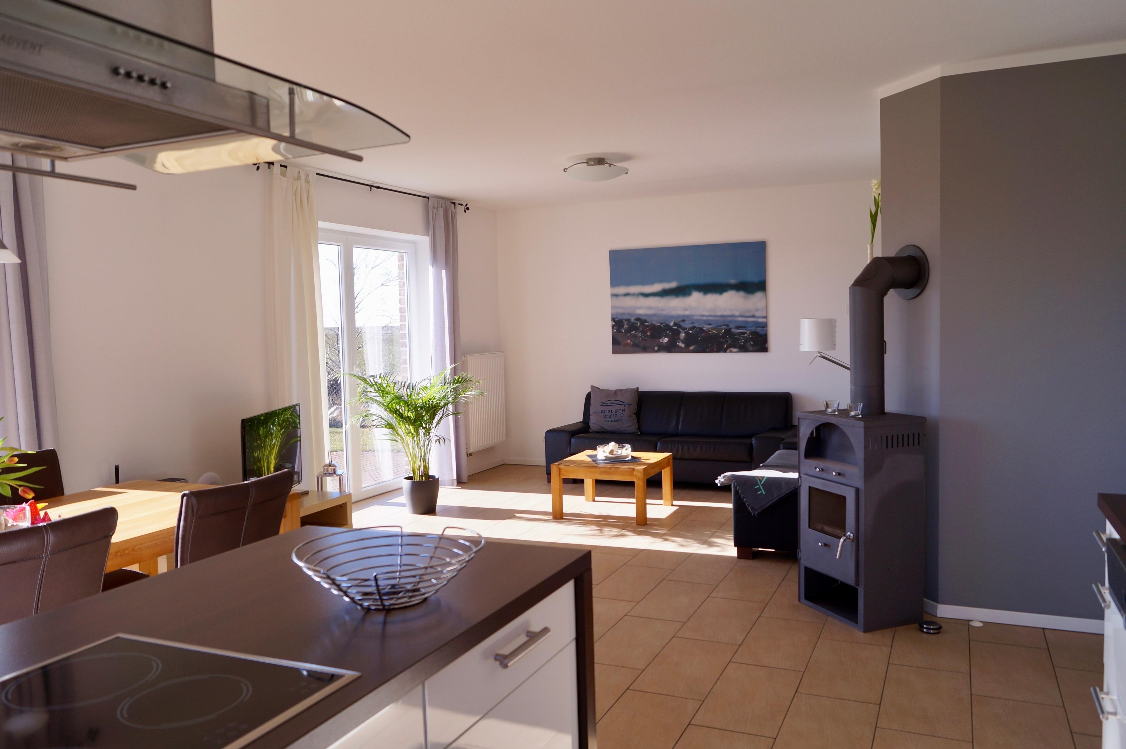 Aus diesem lichtdurchfluteten Raum können Sie direkt auf die Süd- Westterrasse treten, die über einen Strandkorb, Sonnenschirm, einen Tisch mit ausreichend Stühlen und einem Grill verfügt.