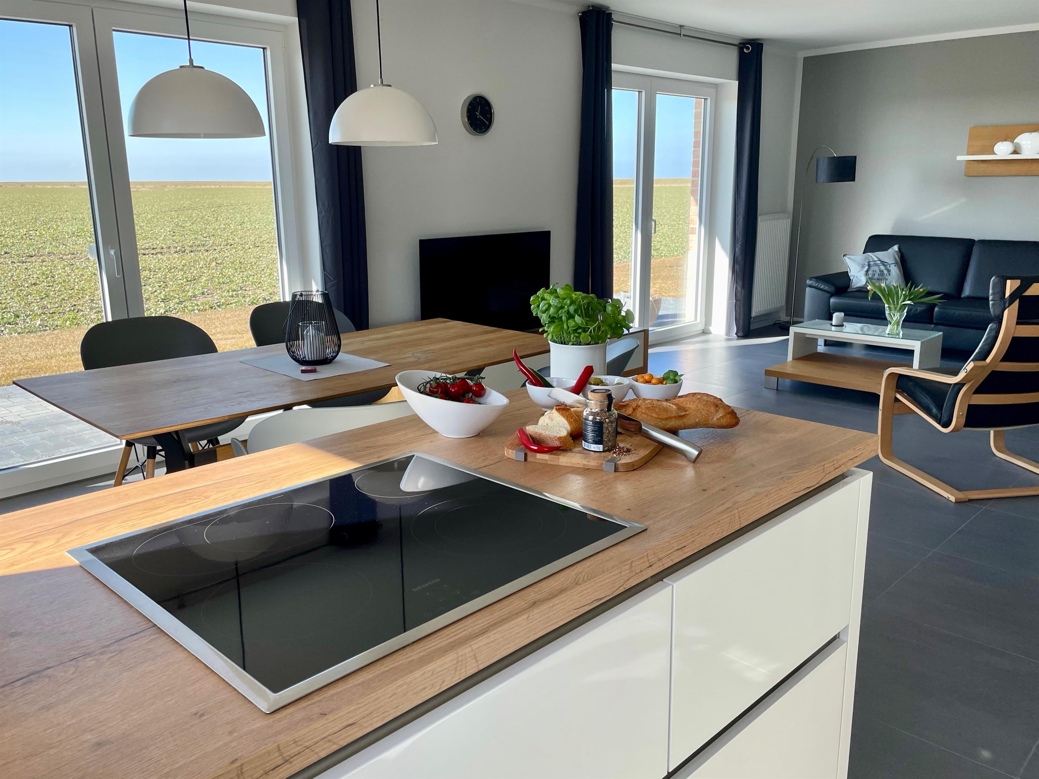Bei dem Ferienhaus Westwind handelt es sich um einen 100 m/2 großen ebenerdigen Bungalow. Dieser verfügt über zwei Schlafzimmer mit Doppelbetten und über zwei Duschbäder mit begehbarer Dusche. Das Highlight des Hauses ist der große Wohn- Essbereich mit Küche und Kochinsel. Von diesem gelangt man auf die Süd-/Westterrasse mit Blick auf die Felder.