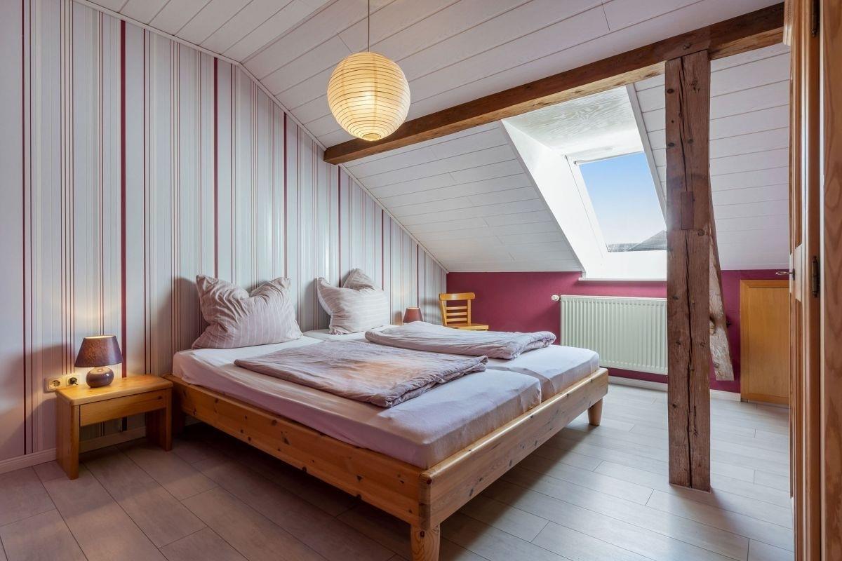 Die Ferienwohnung befindet sich im ersten Stock und ist mit 115 m² für Familien hervorragend geeignet. Durch den seperaten Eingang kommt man ins Treppenhaus mit genügend Platz für Jacken, Schuhe und auch Kinderwagen. Eine Steintreppe führt in die Wohnung. Vom zentralen Flur aus erreicht man alle Zimmer. Zwei der drei Schlafzimmer verfügen über ein Doppelbett, eins über drei Einzelbetten.