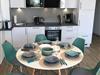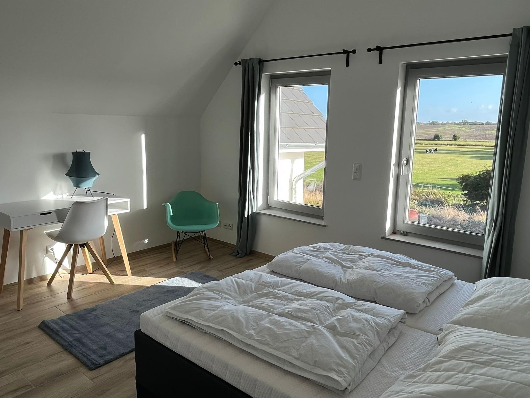 OG: 1 Schlafzimmer mit Doppelbett 160x200 (2x80cm Matratzen) mit Platz für ein mitgebrachtes Babybett. Schlafzimmer 2 mit Etagenbett für 3 Personen (140x200 und 90x200) ausgestattet mit großem Smart-TV. Das Tageslicht-Bad verfügt über Doppelwaschplatz, große Dusche, Badewanne und Waschtrockner.