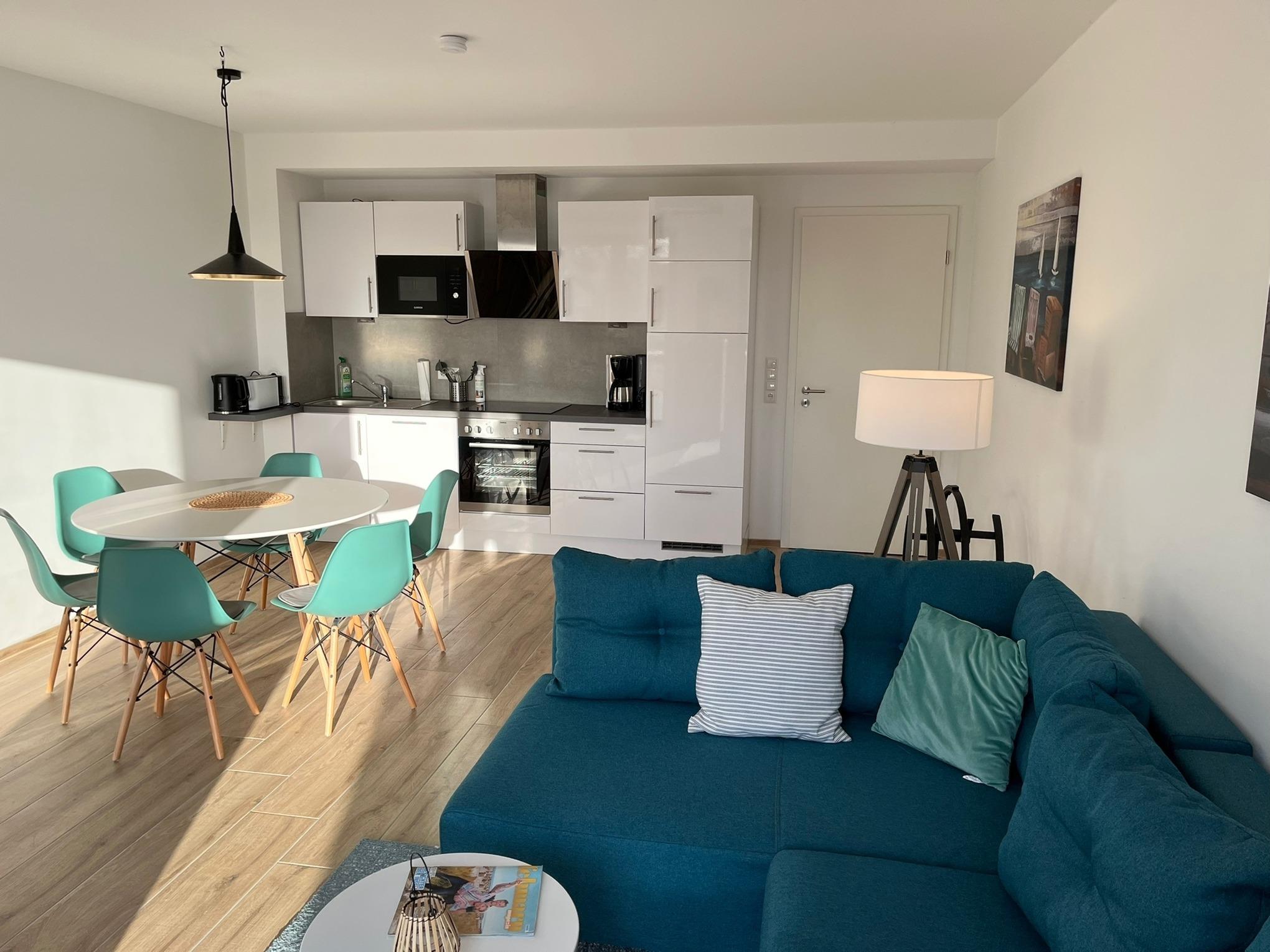EG: zur Südseite lichtdurchfluteter offener Wohn-und Küchenbereich mit Kaminofen und großem Smart-TV. Die Wohlfühl-Südterrasse mit Strandkorb, Liegen und Relax-Stühlen lädt zum Sonnenbad und verweilen ein. Die Küche ist voll ausgestattet.