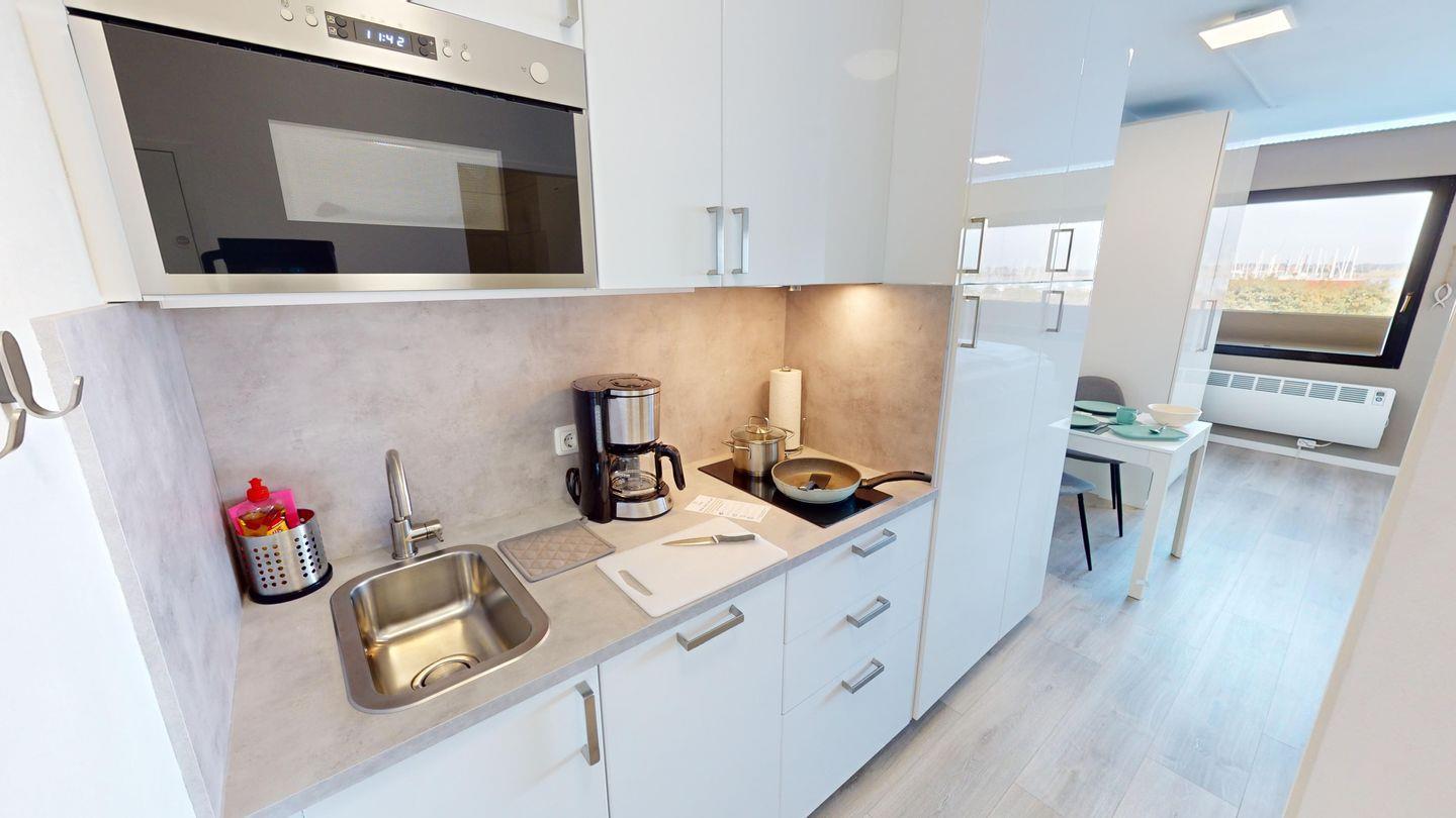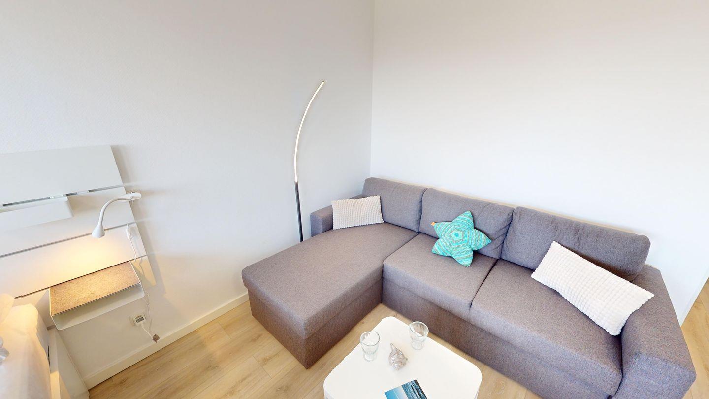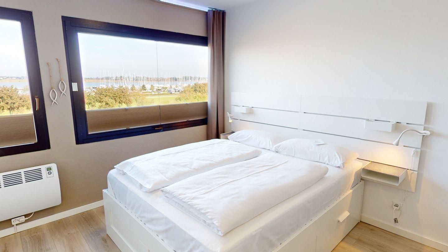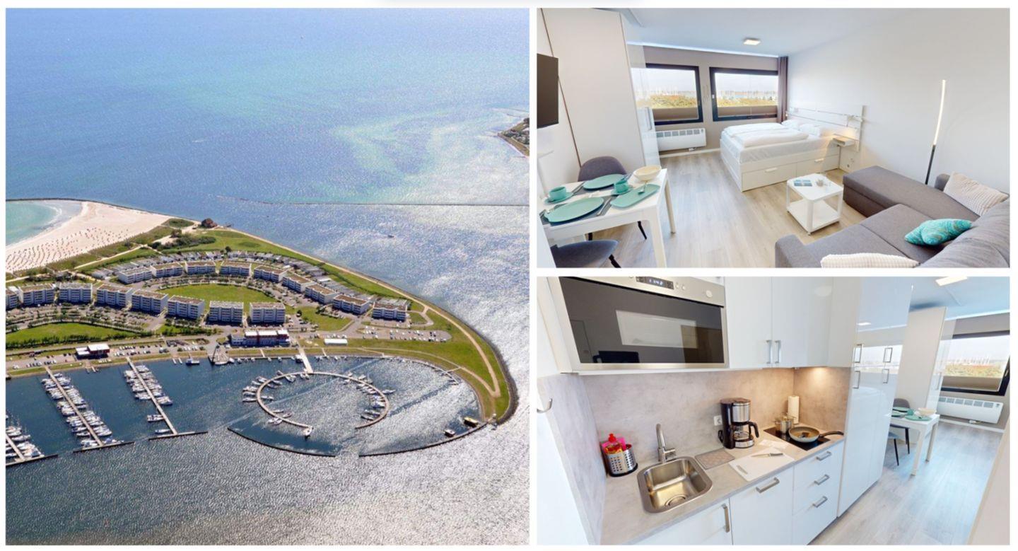 Moderne 1-Zimmer-Ferienwohnung für 2 Erwachsene und 1 Kind mit Doppelbett, Parkplatz, Küche & Bad - Yachhafenblick am Südstrand auf Fehmarn