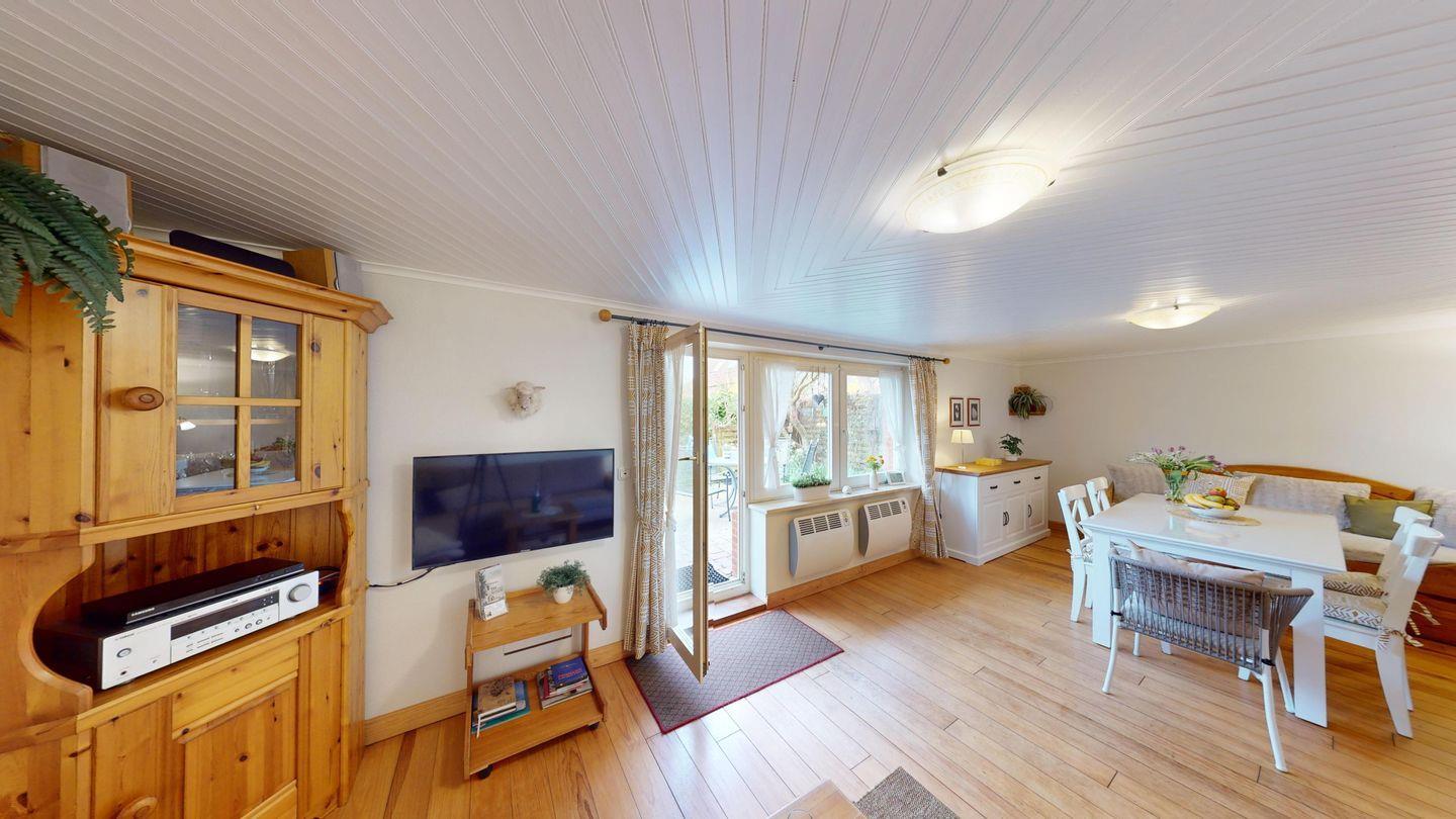 Schon beim Ankommen spüren Sie die besondere Atmosphäre des Hauses: Reetgedecktes Dach, Ruhe, frische Meeresluft – Entschleunigung ab der ersten Minute. Im Inneren erwarten Sie drei behagliche Schlafzimmer (zwei mit Doppelbett, eines mit Einzelbett), ein gemütliches Wohnzimmer, zwei moderne Duschbäder sowie eine voll ausgestattete Küche, die zum gemeinsamen Kochen einlädt.