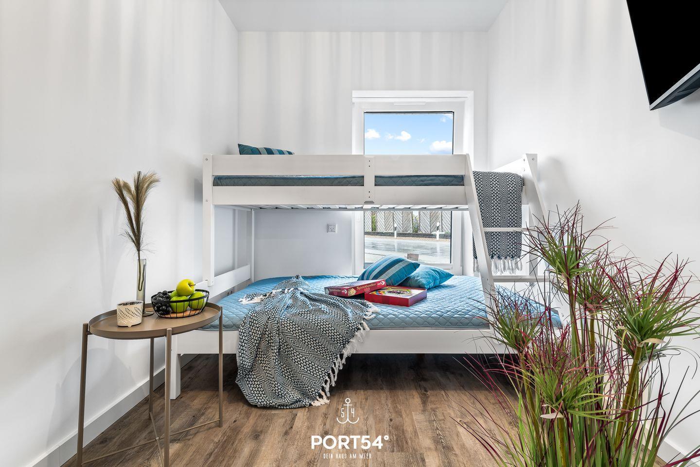 Die Schlafplätze der Erdgeschosswohnung verteilen sich auf zwei Schlafzimmer. Eines verfügt über ein großes Doppel-Boxspringbett (180x200 cm) für zwei Personen. Im zweiten Schlafzimmer befindet sich ein raffiniertes Etagenbett mit einer Liegefläche von 90x200 cm oben und großzügigen 140x200 cm unten für bis zu zwei Personen. Zusätzlich verfügt das Etagenbett über eine ausziehbare Matratze von 90x200 cm und bietet eine weitere Schlafgelegenheit. Das Sofa im Wohnbereich lässt sich ausziehen und könnte als weitere Schlafgelegenheit dienen.