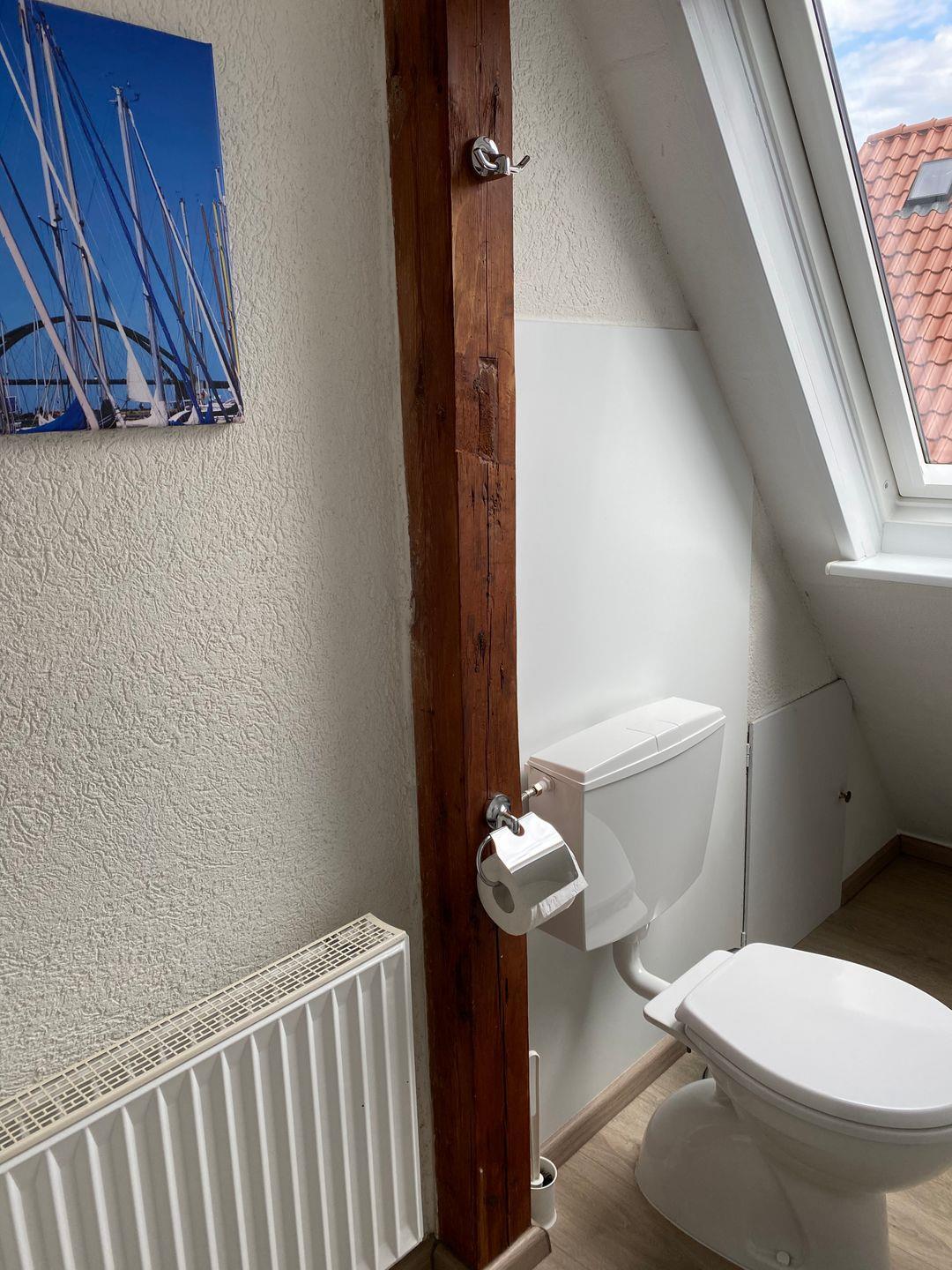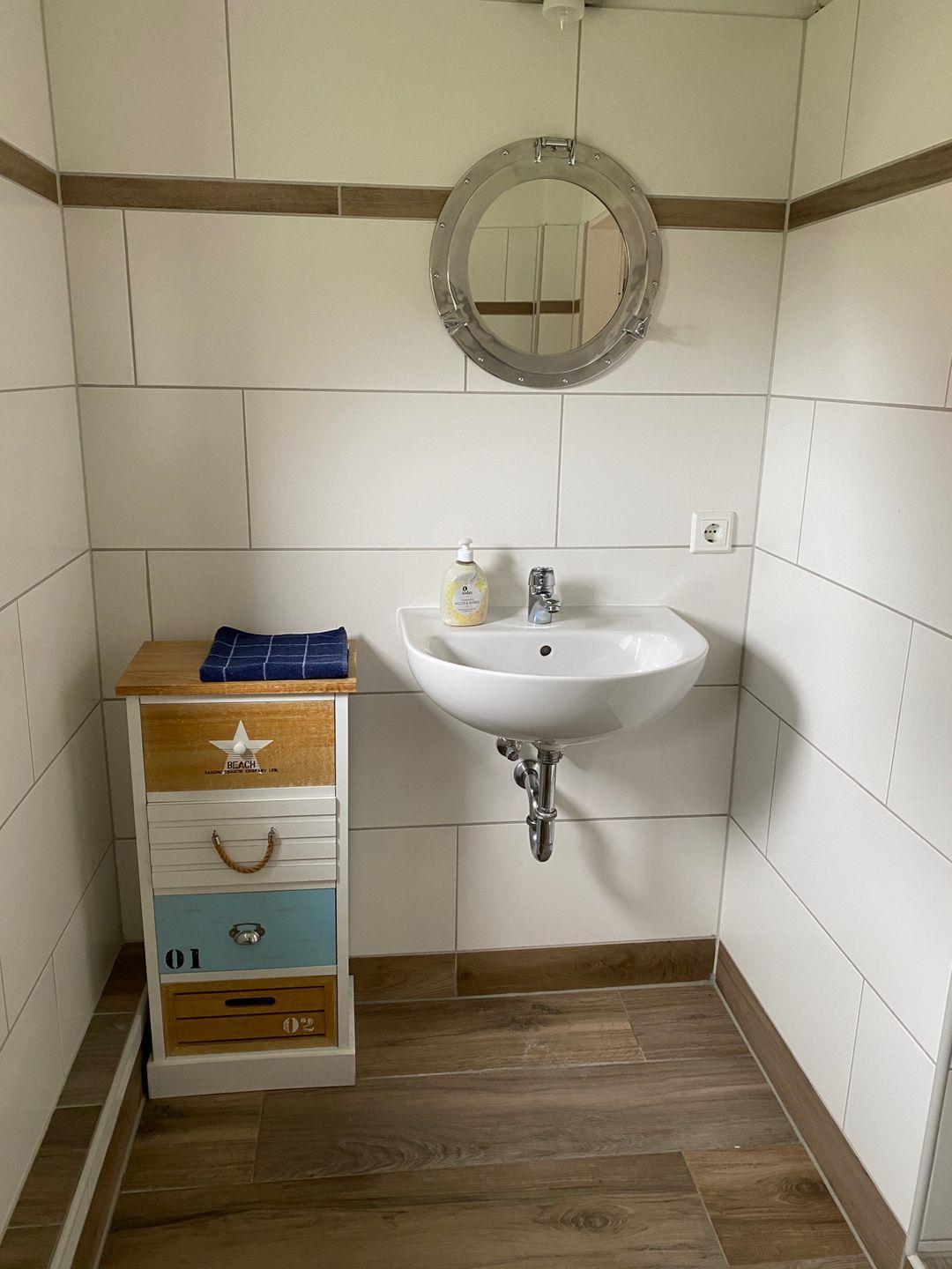 Im EG befindet sich ein Badezimmer mit Dusche, WC und Waschtisch. Im OG befindet sich ein weiteres Badezimmer mit WC und Waschbecken.