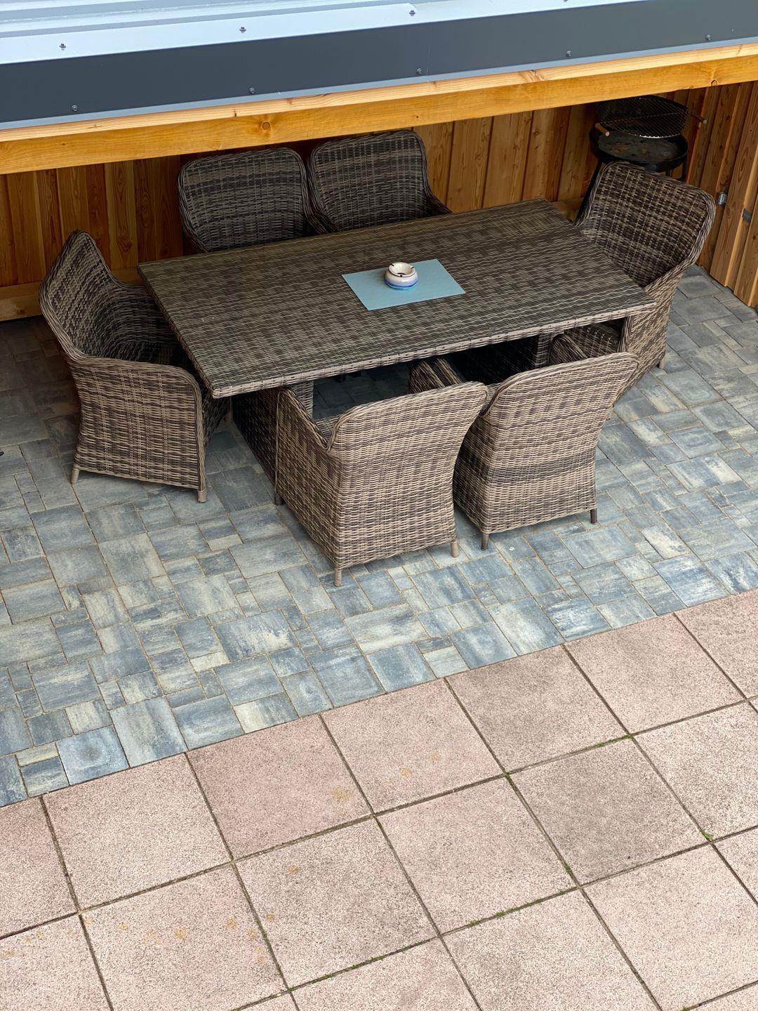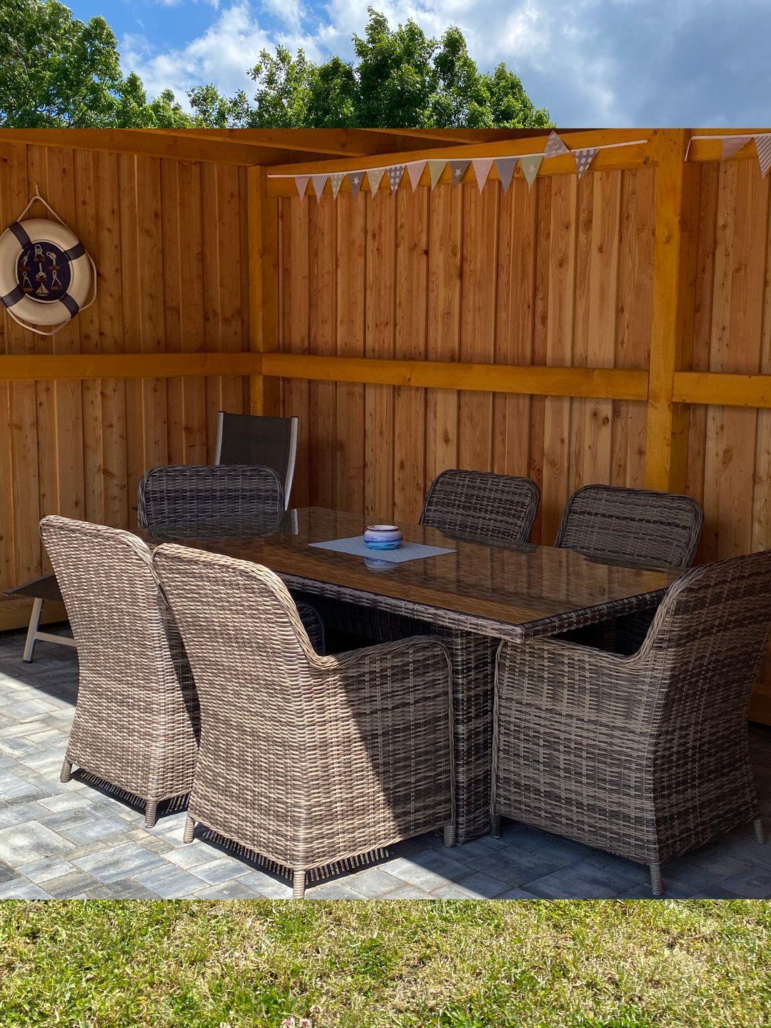 Im Außenbereich steht ihnen eine möblierte, teilüberdachte Terrasse mit Grill zur Verfügung. Das eingezäunte Grundstück ist ca. 1000qm groß.