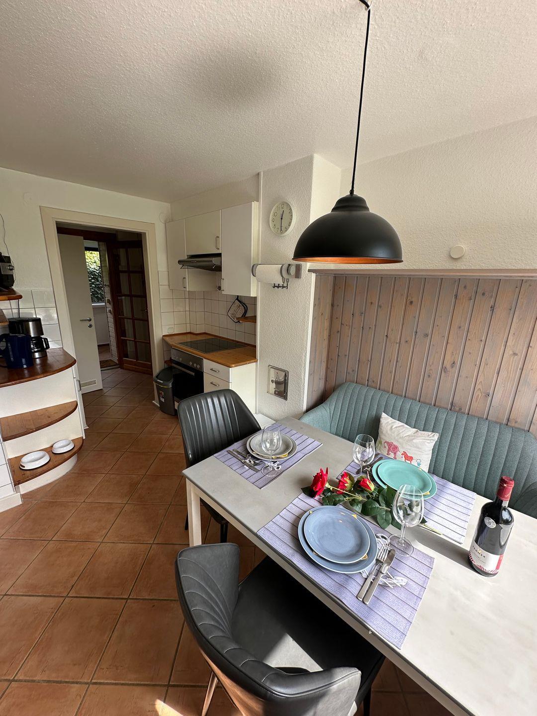 Unsere liebevoll eingerichtete Ferienwohnung verfügt über einen großzügigen Eingangsbereich mit reeller Garderobe, eine Küche mit Cerankochfeld, Backofen und Kühlschrank mit Gefrierfach zum Kochen einlädt. Die zubereiteten Mahlzeiten können Sie gemeinsam am gemütlichen Esstisch in der Küche einnehmen.