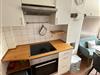 Voll ausgestattete Einbauküche, inklusive Mikrowelle und Esstisch.