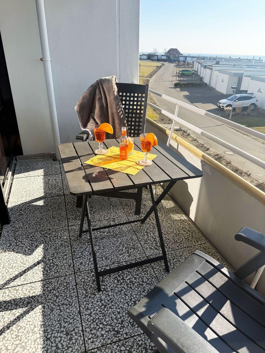 Genießen Sie nach schönen Strandtagen Ihre Abende bei einem Glas Wein auf dem Balkon, mit traumhaften Ausblick auf die Ostsee die Hafenausfahrt und den Strand.