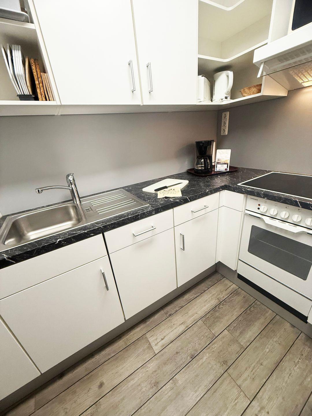 Toaster, Besteck, Mikrowelle, Ceranfeld, Küchenzeile, Gefrierfach, Geschirr, Kühlschrank, Spülmaschine, Kochtöpfe, Filterkaffeemaschine, Backofen, Wasserkocher