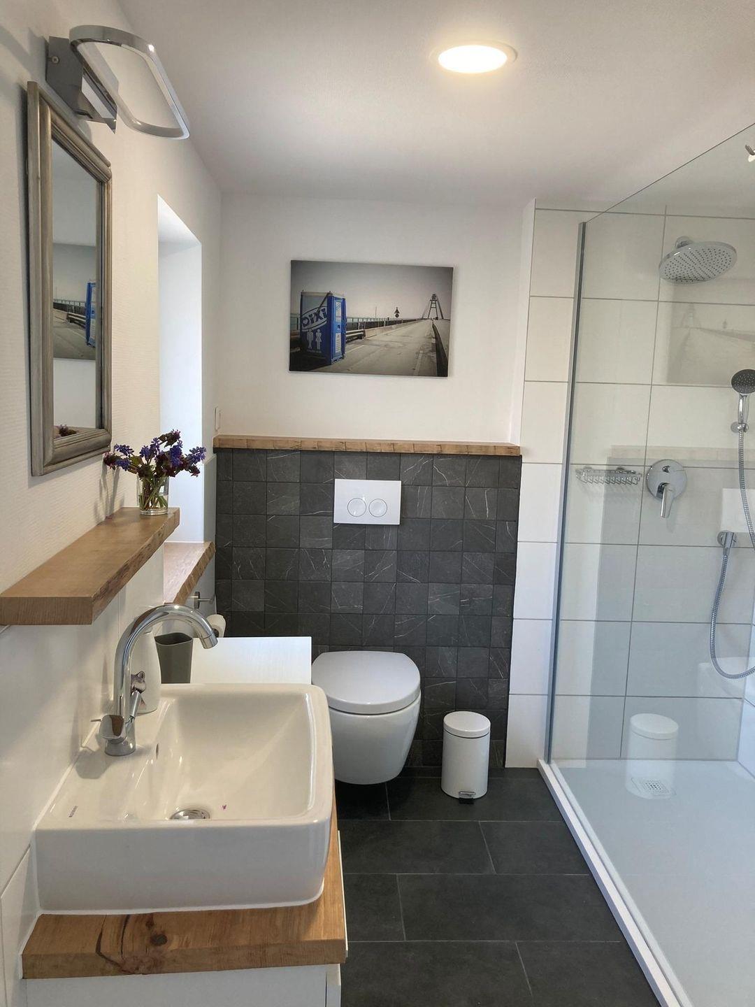 Kleine Dusche, Waschtisch, Fensterbank und Ablage aus altem aufgearbeiteten Holz (Original Flüsterhölzer), Toilette
