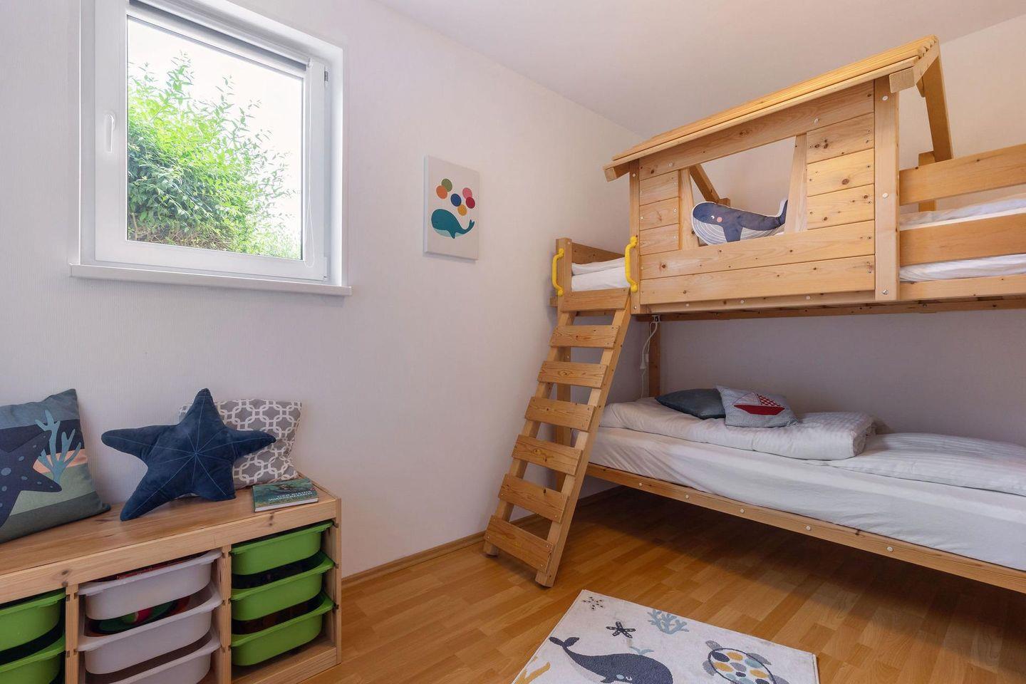 Ein geschmackvoll eingerichtetes Wohnzimmer mit gemütlicher Couch und TV, Kostenloses WLAN, das Schlafzimmer mit großem Doppelbett, ein Kinderzimmer mit Etagenbett, eine separate Küche mit Herd, Backofen, Kühlschrank, Kaffeemaschine und allen notwendigen Küchenutensilien, sowie ein modernes Bad mit Dusche. Außerdem haben Sie eine eigene Terrasse mit eigenem Garten, indem Sie die Sonnenstunden genießen können.