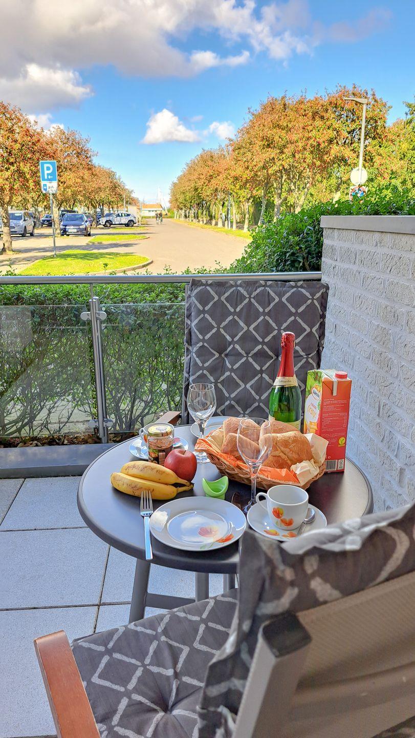 Die große bodentiefe Fensterfront, die etwa zwei Drittel der Raumbreite einnimmt, sorgt für viel Licht und bietet Zugang zur geräumigen West-Terrasse. Diese ist das Highlight der Wohnung in der warmen Jahreszeit. Hier können Sie herrlich frühstücken und am Nachmittag bis zum Sonnenuntergang nochmals üppige Sonnenstunden nach Strand oder Ausflug (wenn die anderen schon im Schatten sitzen) genießen. Die lauen Abende klingen hier bei einem feinen Gläschen Wein oder einem Spieleabend besonders entspannt oder lustig aus. Die Terrasse ist mit einer Edelstahlbrüstung und Sicherheitsglas umrahmt und bietet durch die vorgelagerte Hecke ausreichend Sichtschutz.