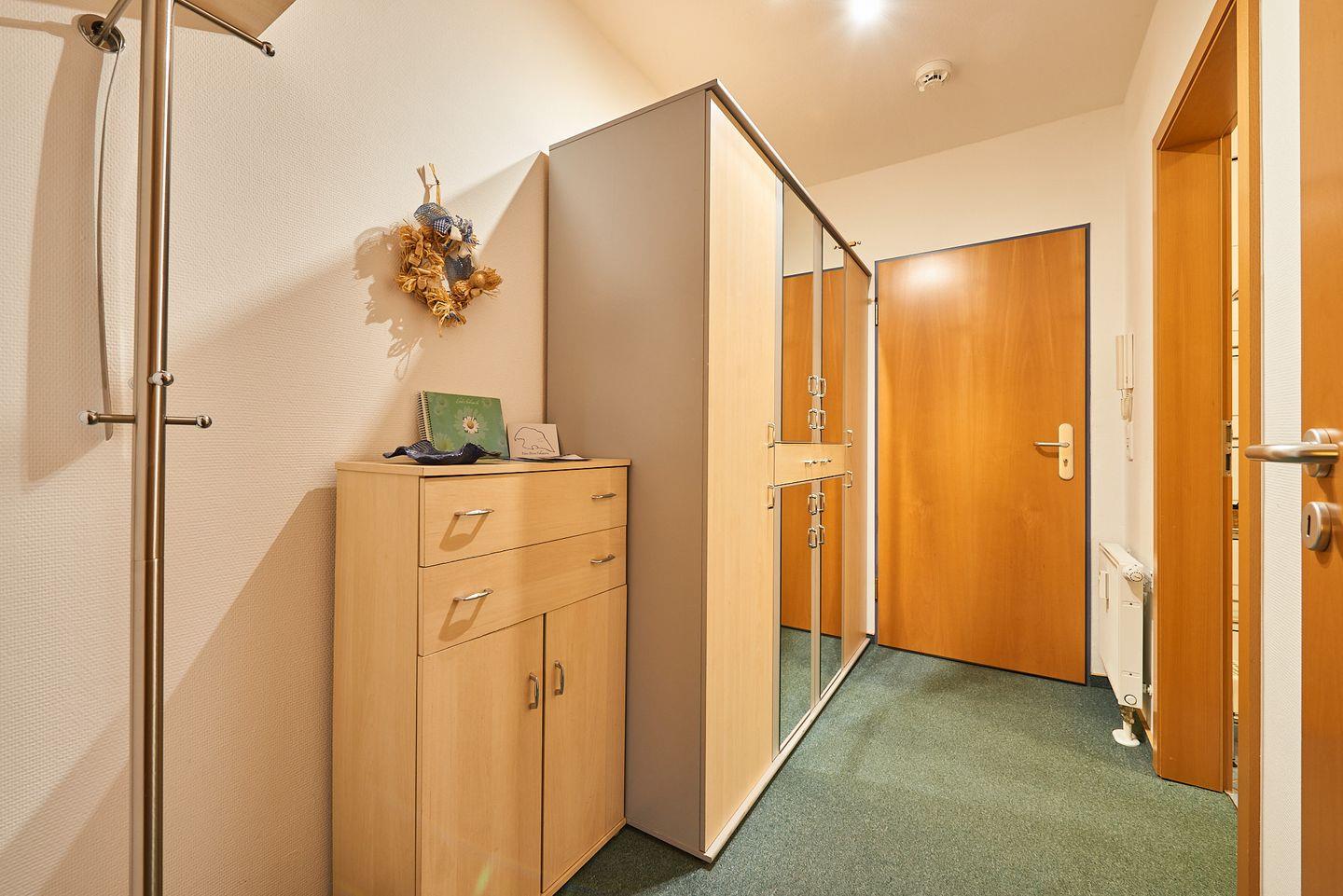 Im Eingangsbereich stehen Ihnen ein geräumiger Kleiderschrank (1,5 m x 2 m) mit mehreren Ablagen sowie ein kleiner Garderoben- und Schuhschrank zur Verfügung. Gemeinsam mit dem Schrank im Wohnbereich bietet dies ausreichend Stauraum für Ihre persönlichen Dinge. Hier finden Sie zudem ein Fach mit Spielsachen als auch Utensilien wie Sonnenschirm, Staubsauger, Besen, Eimer etc.