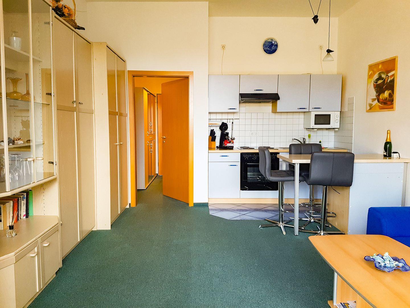 Rückseitig in den Wohnbereich integriert, befindet sich die voll ausgestattete Küchenzeile mit vier Kochplatten, Backofen, Mikrowelle, Spülbecken und sämtlichem Küchenzubehör sowie Geschirr, das Sie für einen gelungenen Aufenthalt und die Bewirtung von Gästen benötigen. Die praktische Esstheke (für 3 Personen) mit integriertem Einbaukühlschrank (ohne Eisfach) bildet einen eleganten Übergang zum Wohnbereich. Kaffeemaschine, Wasserkocher und Toaster stehen selbstverständlich auch bereit.