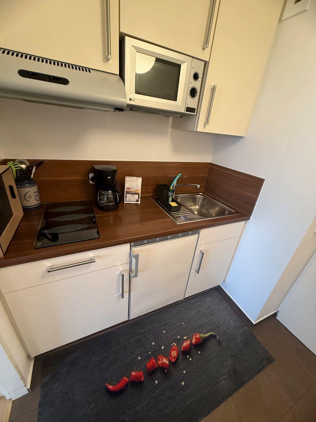 Besteck, Kochfeld, Küchenzeile, Gefrierfach, Geschirr, Kühlschrank, Kochtöpfe, Filterkaffeemaschine, Mikrowelle