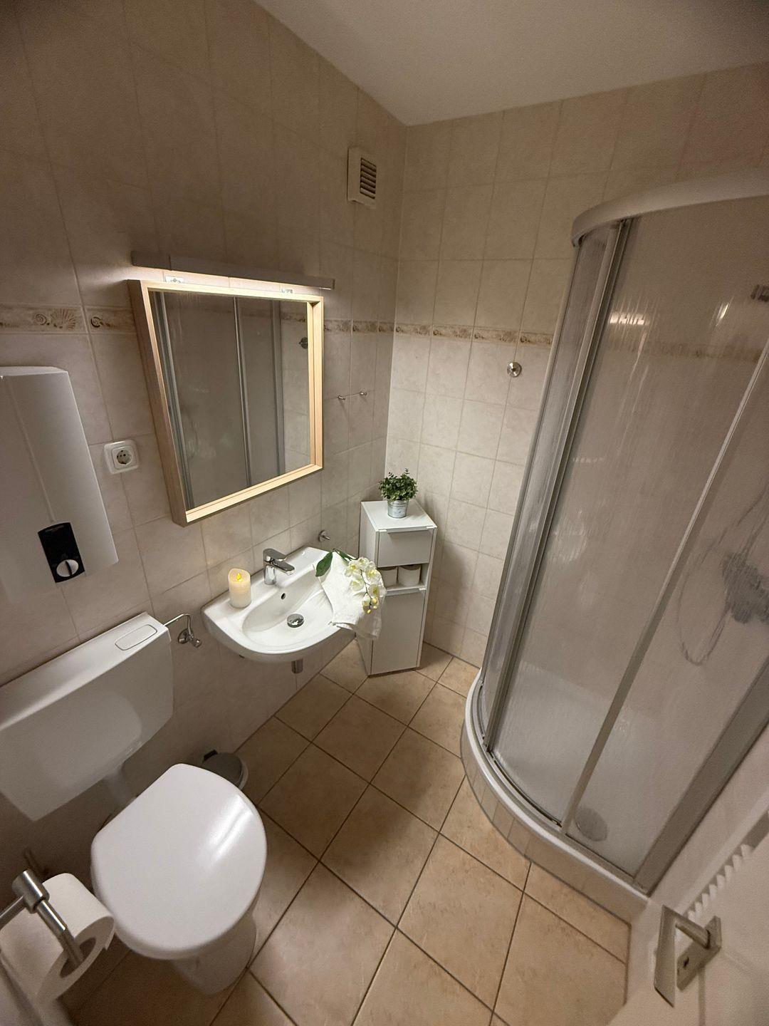 Waschbecken, Spiegelschrank, Dusche, WC, gute Beleuchtung,