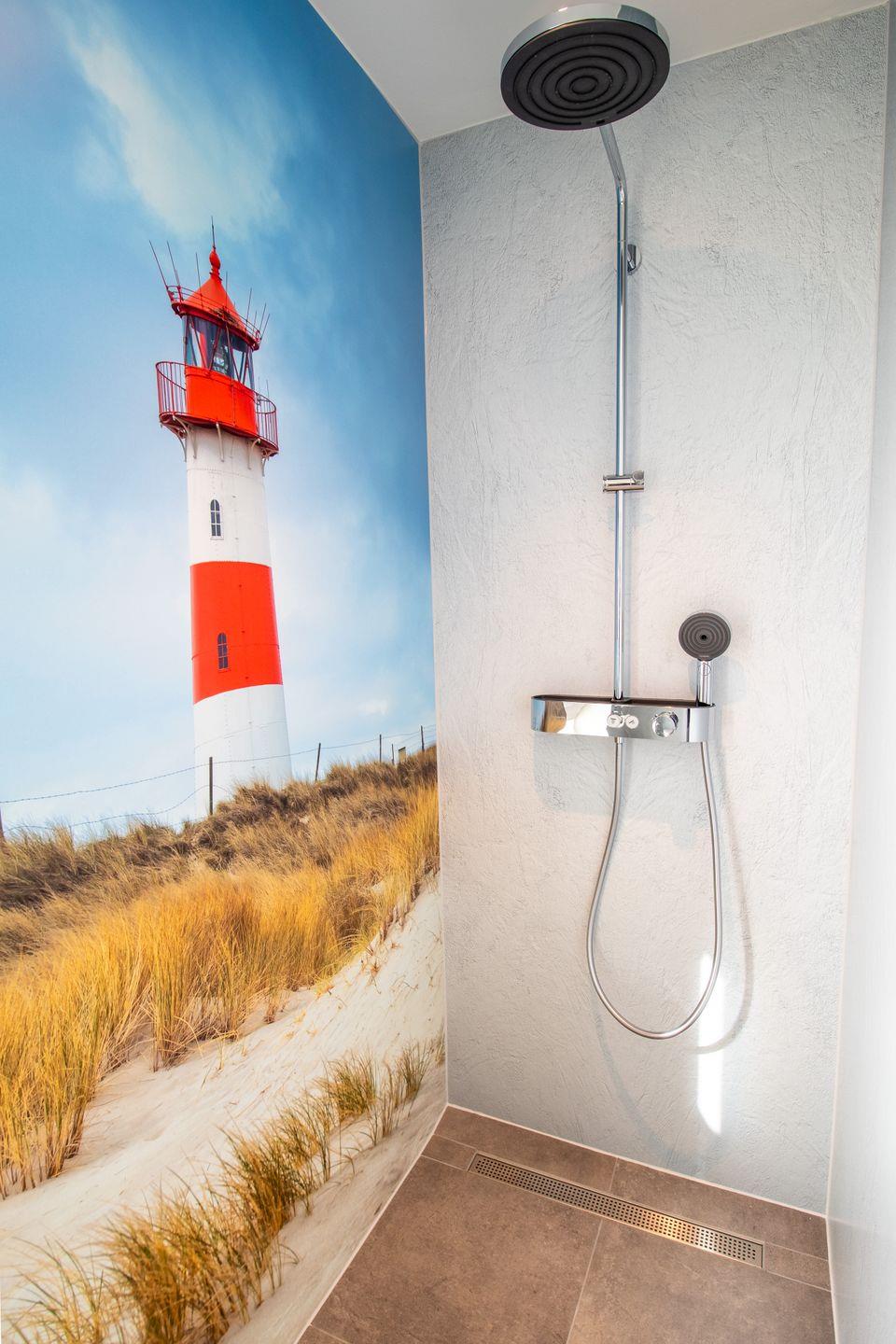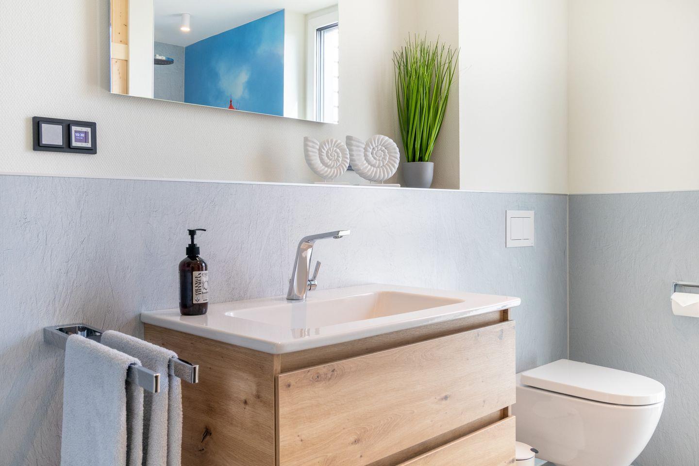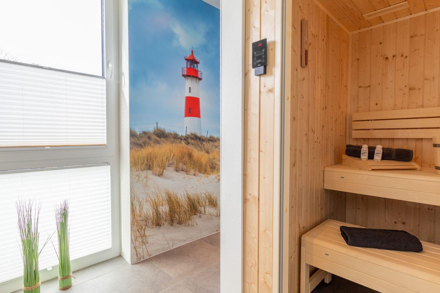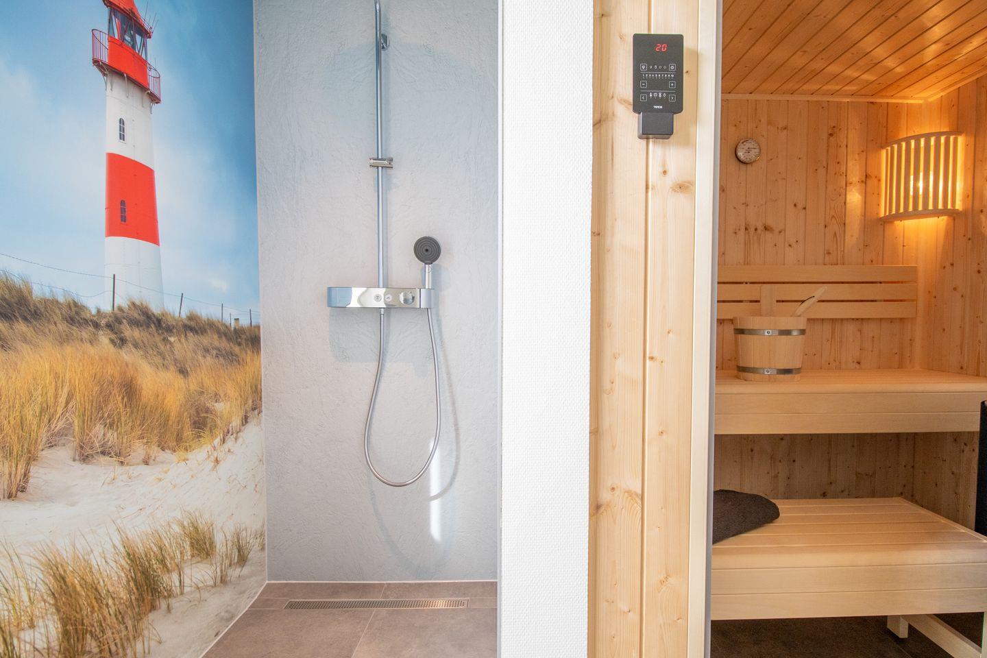 Dein Badezimmer ist eine kleine Wellnessoase. Nach einem erlebnisreichen Tag auf der Insel entspannst du in deiner privaten Sauna oder genießt die großzügige, barrierefreie Dusche. Stilvolle Beleuchtung und edle Materialien machen jeden Aufenthalt im Bad zu einem besonderen Moment der Ruhe.