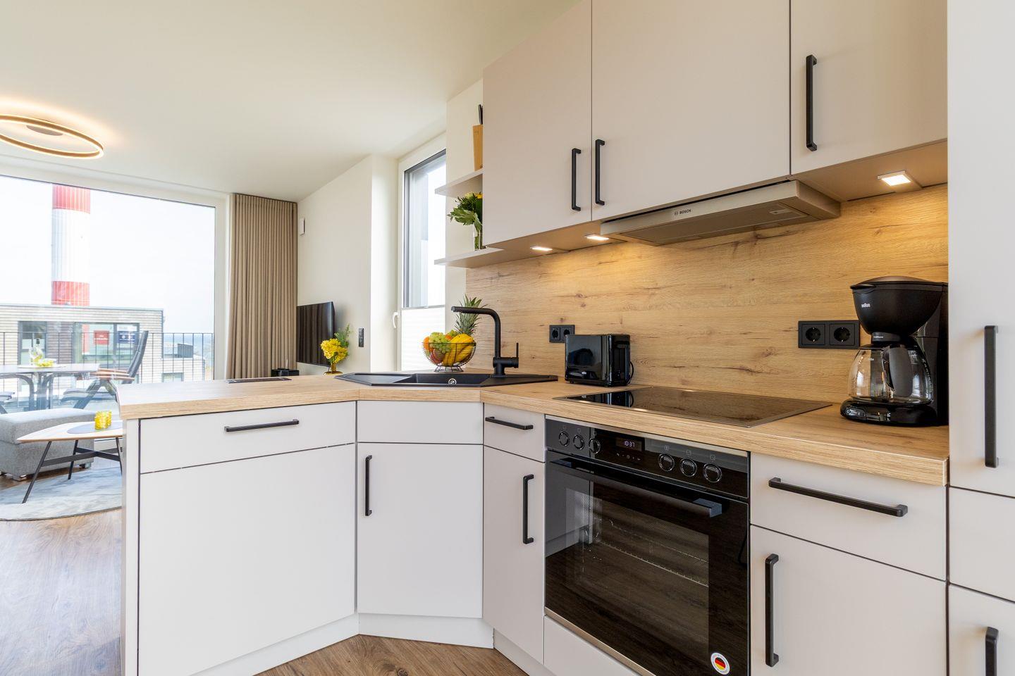 Der offen gestaltete Wohn- und Essbereich empfängt dich mit freundlichen Farben, hochwertigen Möbeln und großen Fenstern, die viel Licht hereinlassen. Die angrenzende Küche ist vollständig ausgestattet mit Markengeräten wie Cerankochfeld, Geschirrspüler und Kaffeemaschine – ideal für entspannte Kochabende. Der direkte Zugang zur umlaufenden Dachterrasse macht das Wohnen hier besonders luftig und lichtdurchflutet. Waschmaschine und Trockner stehen im separaten Wirtschaftsbereich bereit, und ein Aufzug bringt dich bequem ins Staffelgeschoss.