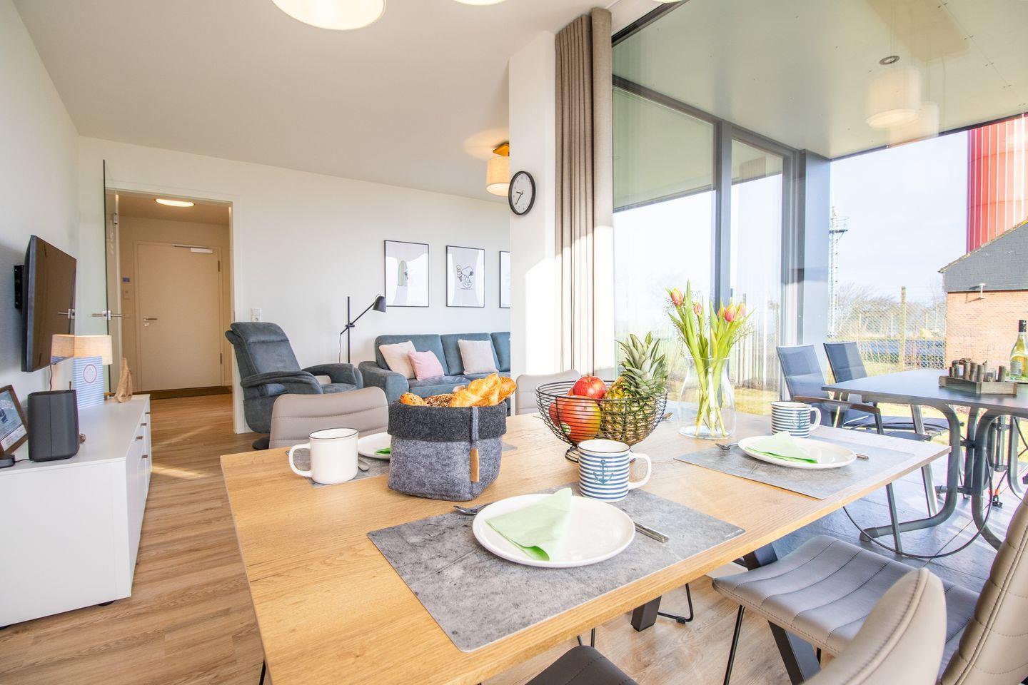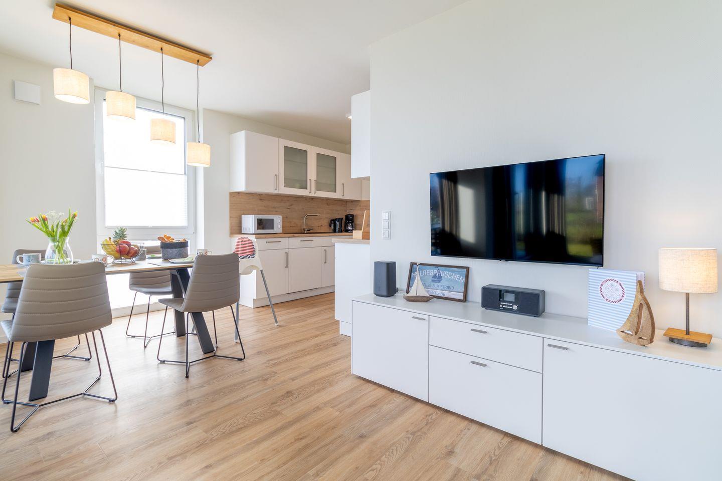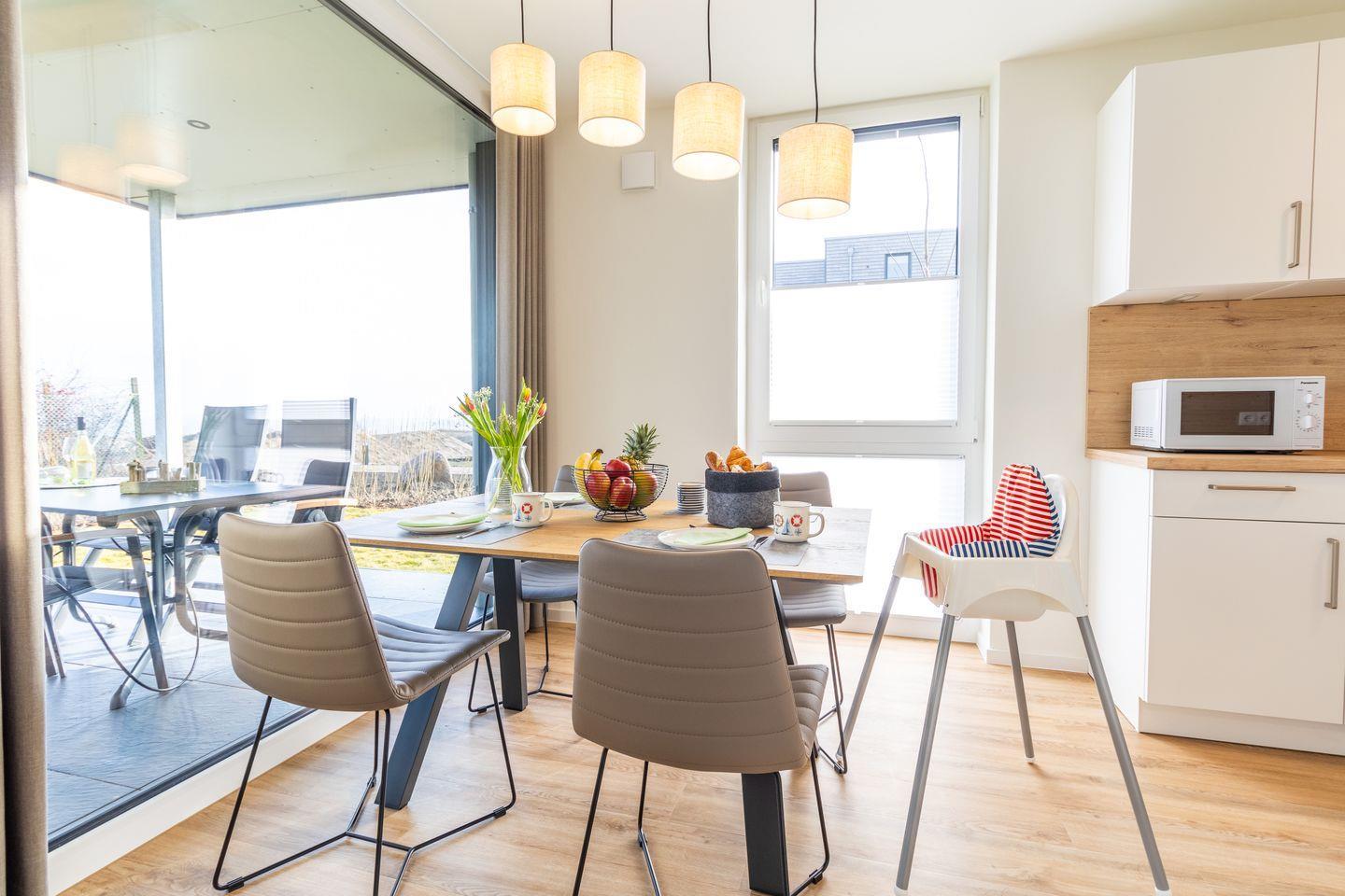 Im offenen Wohnbereich mit bodentiefen Fenstern genießt du Licht, Luft und Meerblick – ob auf dem gemütlichen Relaxsessel oder beim Frühstück auf der überdachten Terrasse. Die offene Küche ist mit Miele-Geräten voll ausgestattet und lädt zum gemeinsamen Kochen ein. Waschmaschine und Trockner sorgen für zusätzlichen Komfort.