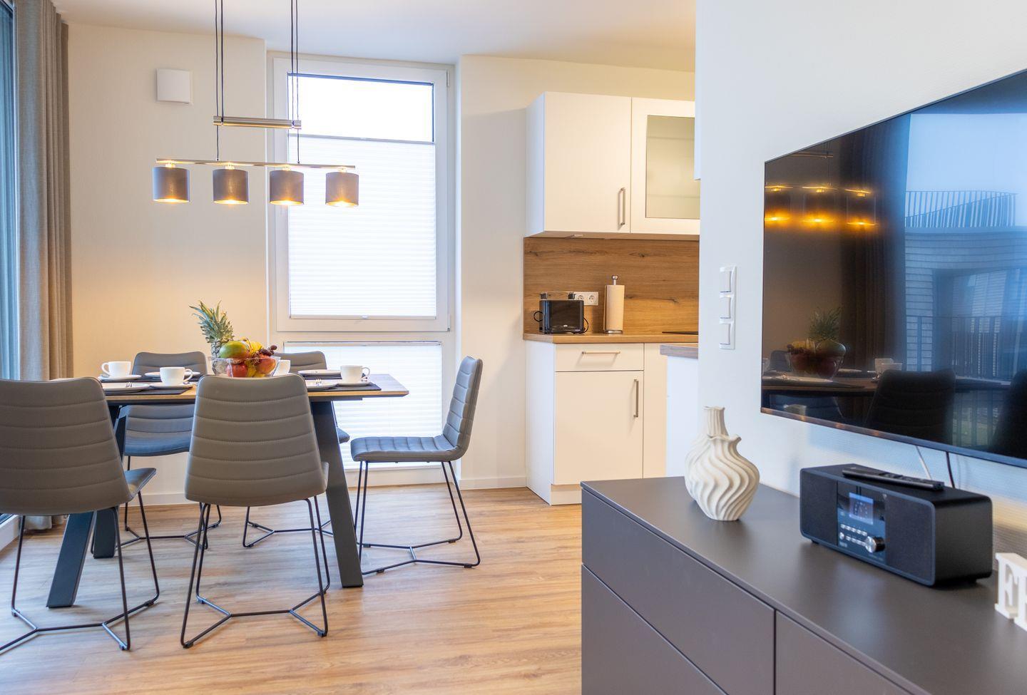 Zwei separate Schlafzimmer mit gemütlichen Boxspringbetten und jeweils einem eigenen Fernseher sorgen für angenehme Nächte und ruhige Rückzugsorte. Die großen Fenster bringen Licht und Luft in die Räume, Verdunkelungsmöglichkeiten sorgen für erholsamen Schlaf. Die Einrichtung ist stilvoll und harmonisch – perfekt zum Entspannen. Wenn du eigene Bettwäsche mitbringen möchtest, beachte bitte, dass alle Betten mit durchgehenden Matratzen ausgestattet sind.
