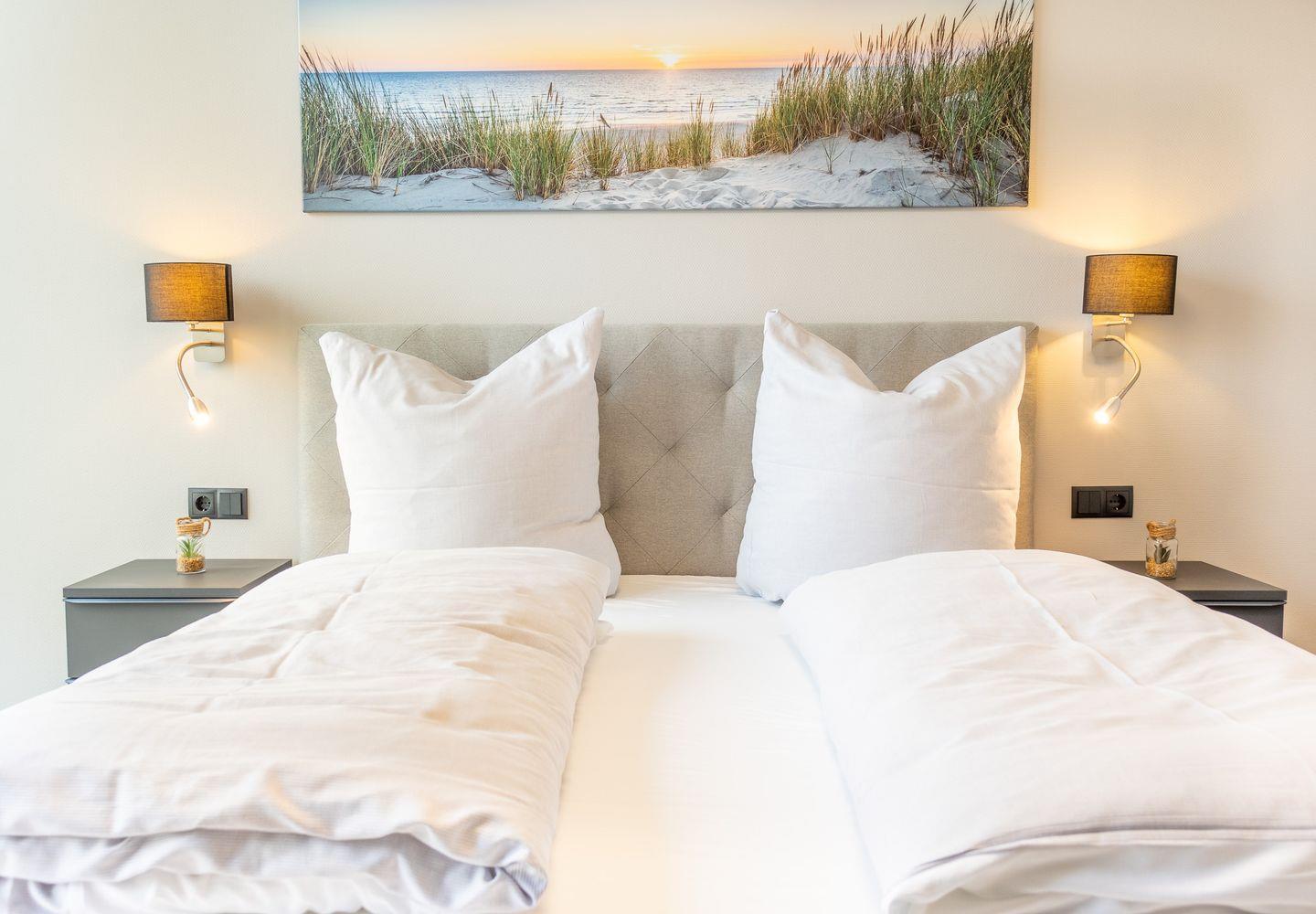 Zwei gemütliche Schlafzimmer mit bequemen Boxspringbetten und sanfter Beleuchtung schaffen perfekte Rückzugsorte. In einem der Schlafzimmer genießt du zusätzlich den Blick aufs Meer. Das Schlafsofa im Wohnzimmer eignet sich gut für Kinder. Alle Betten verfügen über durchgängige Matratzen – Bettwäsche und Handtücher können optional hinzugebucht werden.