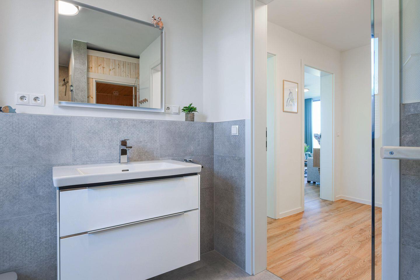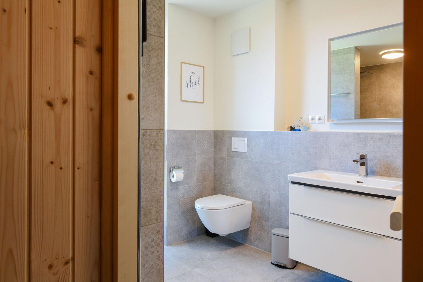 Genieße deine private Sauna und entspanne unter der bodentiefen Dusche. Edle Materialien, stilvolle Beleuchtung und ein großer Spiegel schaffen ein Ambiente zum Wohlfühlen – perfekt für deinen persönlichen Spa-Moment.