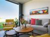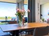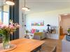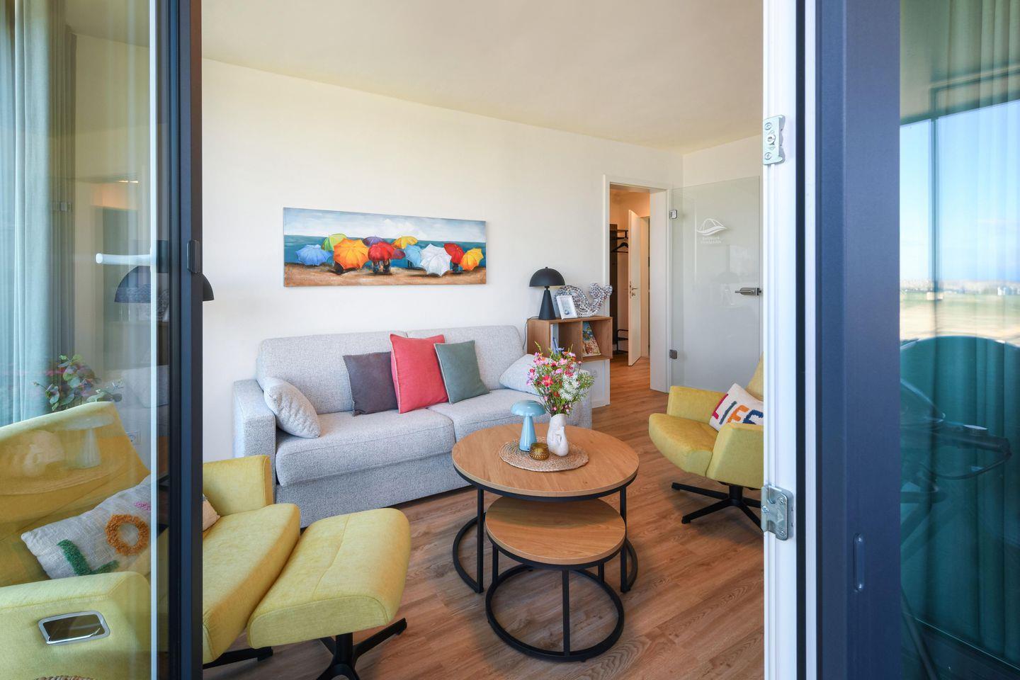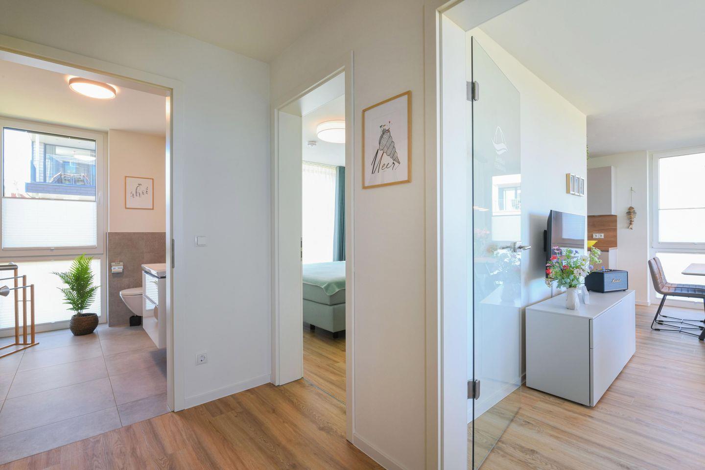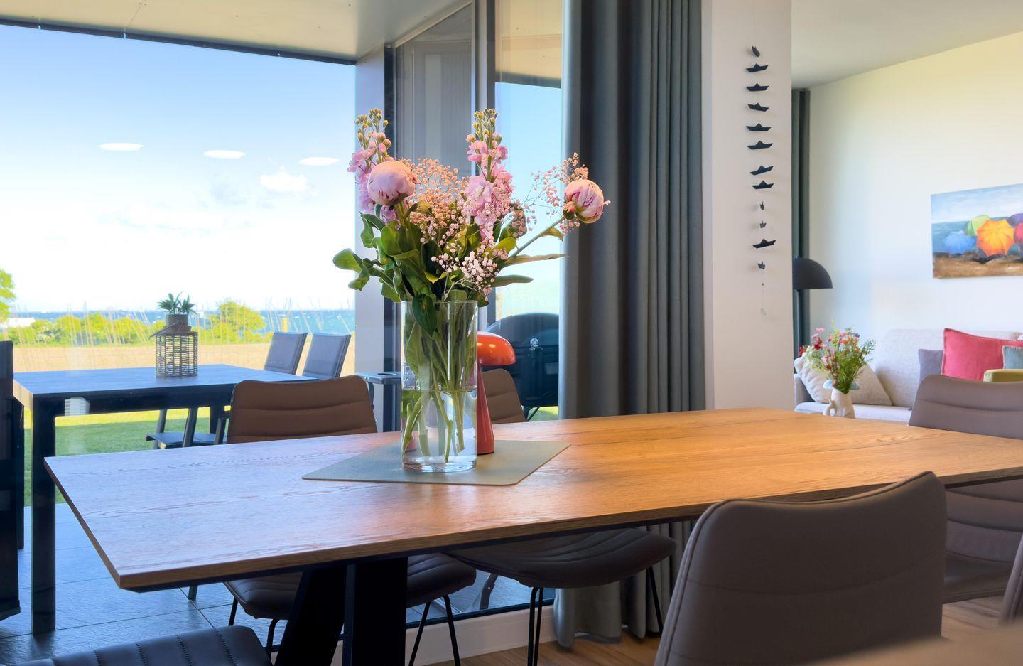 Der lichtdurchflutete Wohnbereich mit bodentiefen Fenstern öffnet sich zur überdachten Terrasse mit Meerblick und Gartenanteil. Die moderne Küche mit hochwertigen Geräten lädt zum gemeinsamen Kochen ein. Am großen Esstisch findet ihr Platz für sechs Personen, das gemütliche Sofa mit Musikbox sorgt für entspannte Abende. Dank Fliegengittern bleibt es dabei immer angenehm ruhig.