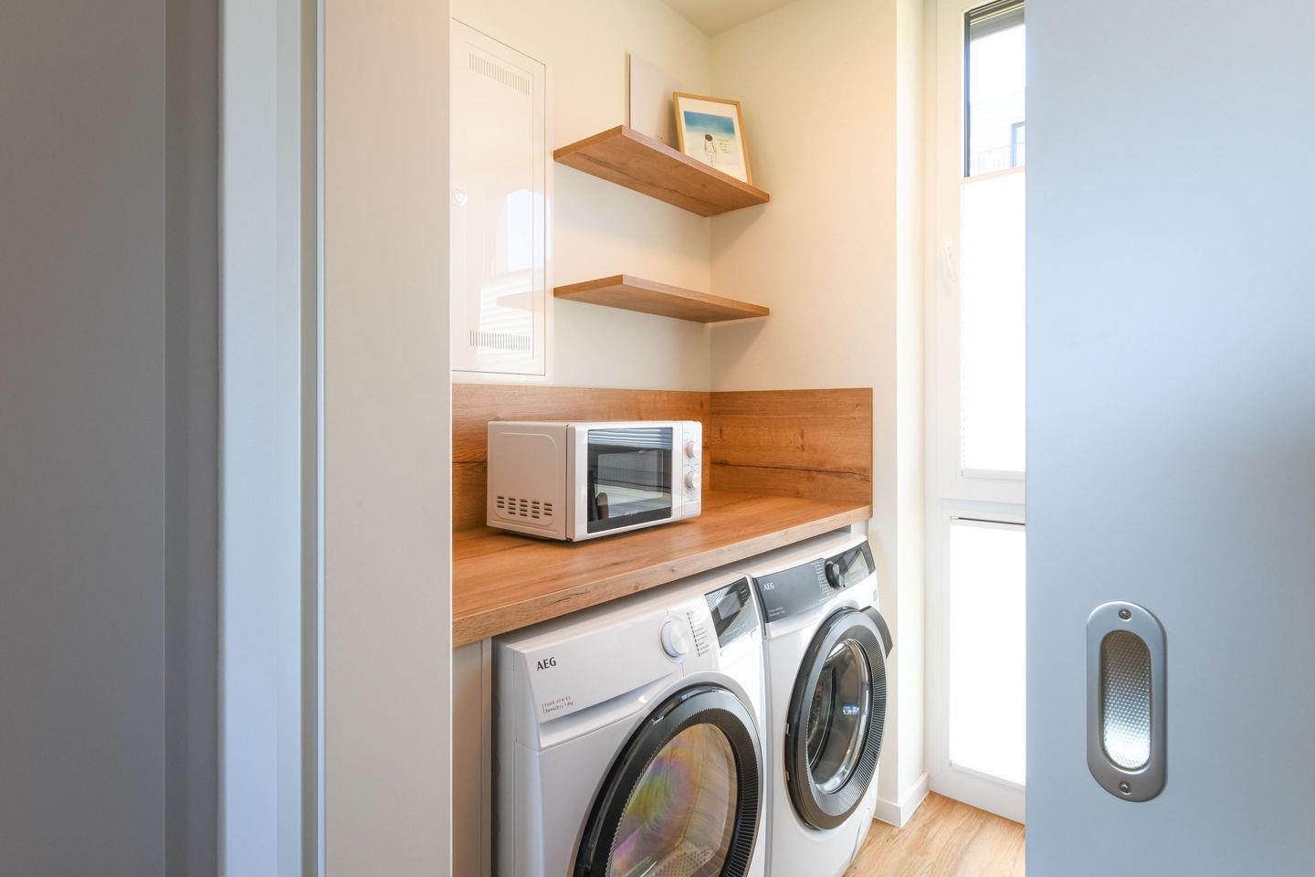 Freue dich auf komfortable Ausstattung: Waschmaschine, ein abschließbarer Fahrradraum mit Lademöglichkeit, kontaktloser Check-in per Schlüsseltresor, ein Stellplatz direkt vor dem Haus und ein Elektrogrill für gesellige Abende auf der Terrasse.