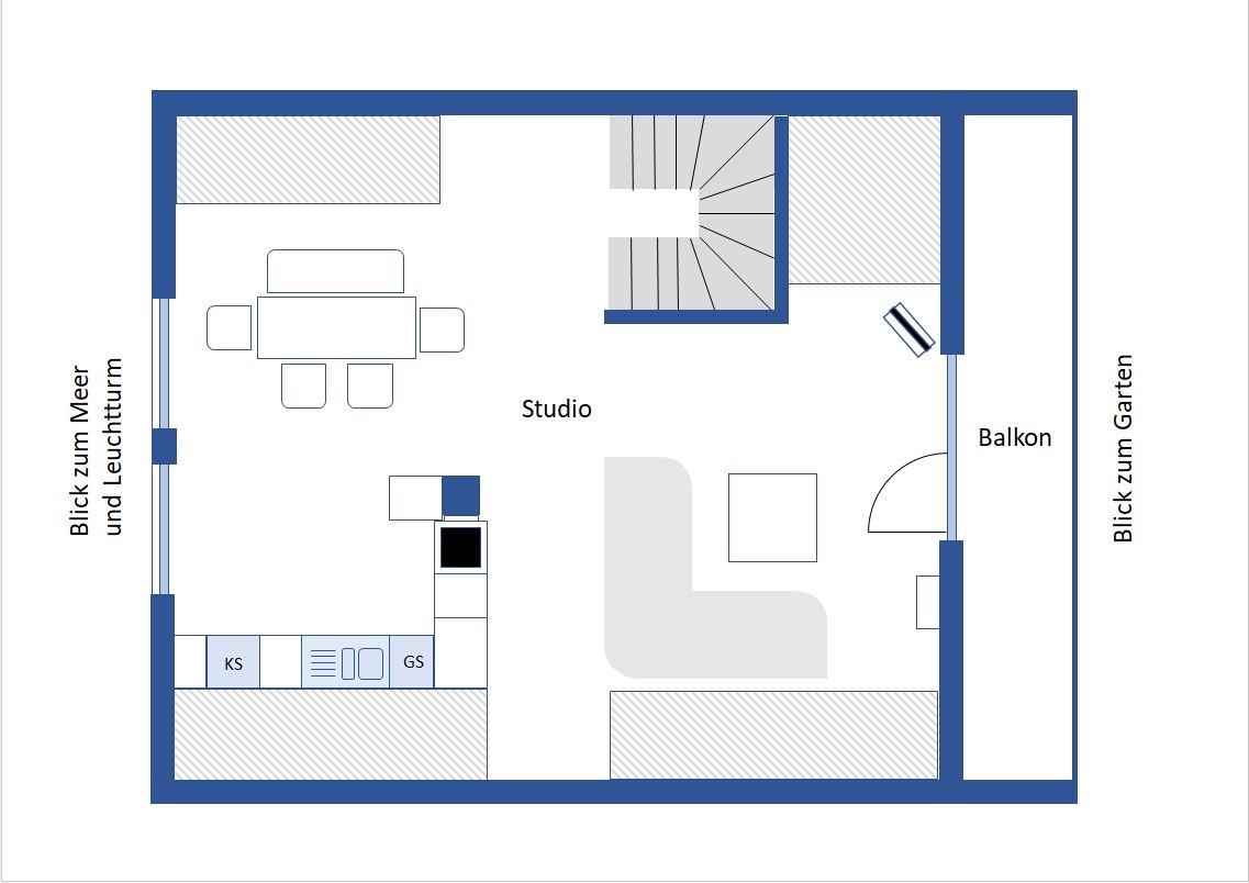 Im Obergeschoss liegt der lichtdurchflutete, offen gestaltete Wohnbereich. Die Küche und der Essbereich bieten einen wunderschönen Blick auf das Meer und den Leuchtturm. Beim Frühstück am großen Esstisch können sie den regen Schiffsverkehr durch den Fehmarn-Belt beobachten. Im Wohnbereich befinden sich ein großes Sofa und ein TV (32 Zoll) mit Satellitenanschluss. Von dem überdachten Südbalkon hat man einen schönen Blick in den Garten.