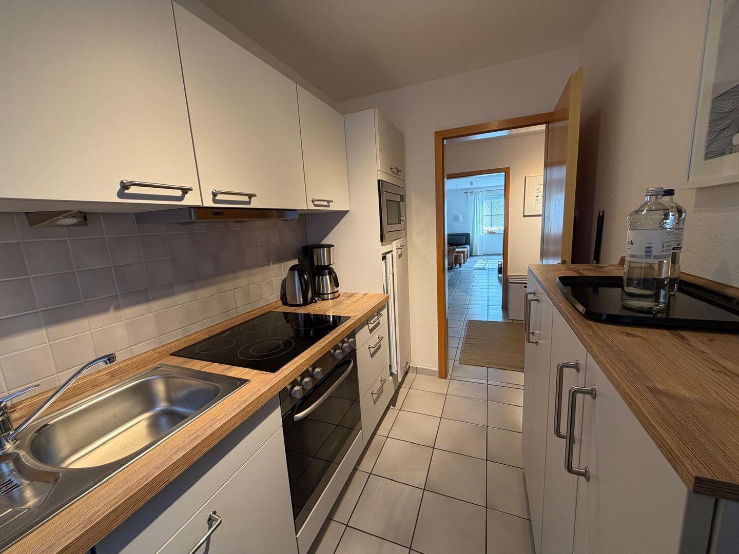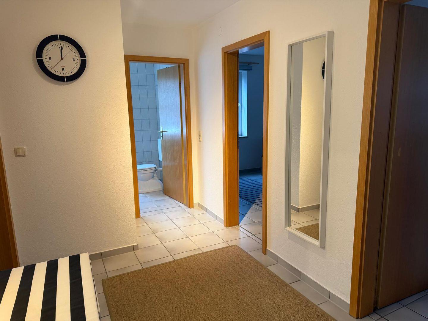 Das Badezimmer ist mit Dusche, Waschbecken und WC ausgestattet. Zusätzlich stehen Ihnen eine Waschmaschine und ein Bügeleisen zur Verfügung, was den Aufenthalt auch bei längerer Reisedauer komfortabel macht.