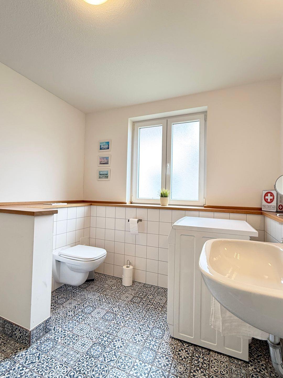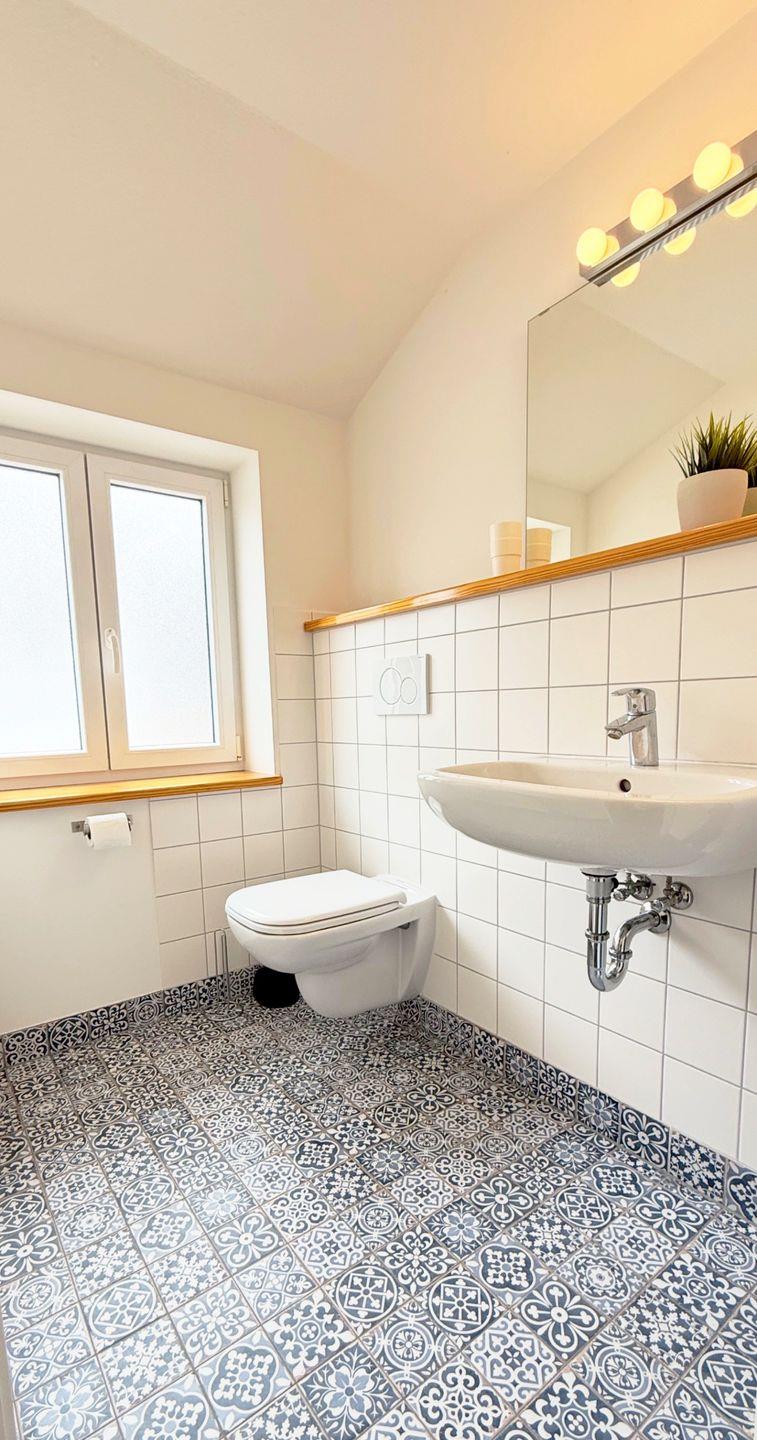 Das Badezimmer ist mit Dusche, WC, Waschbecken und Haartrockner ausgestattet. Zusätzlich stehen Ihnen eine Waschmaschine zur Eigennutzung, Wäscheständer und Bügeleisen zur Verfügung. Heizung und Rauchmelder tragen zu einem angenehmen und sicheren Aufenthalt bei.