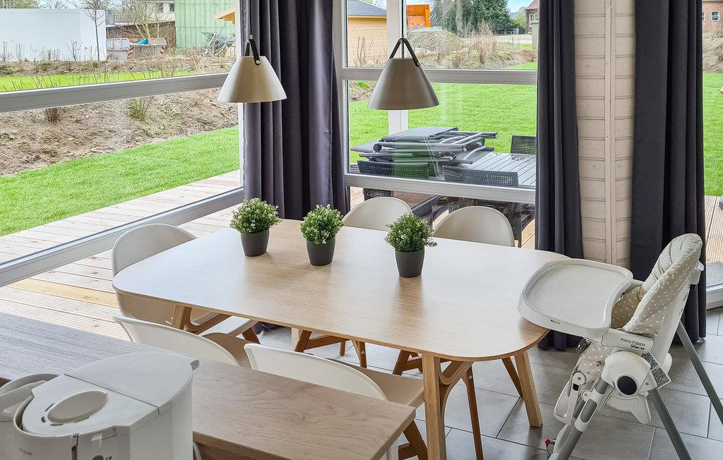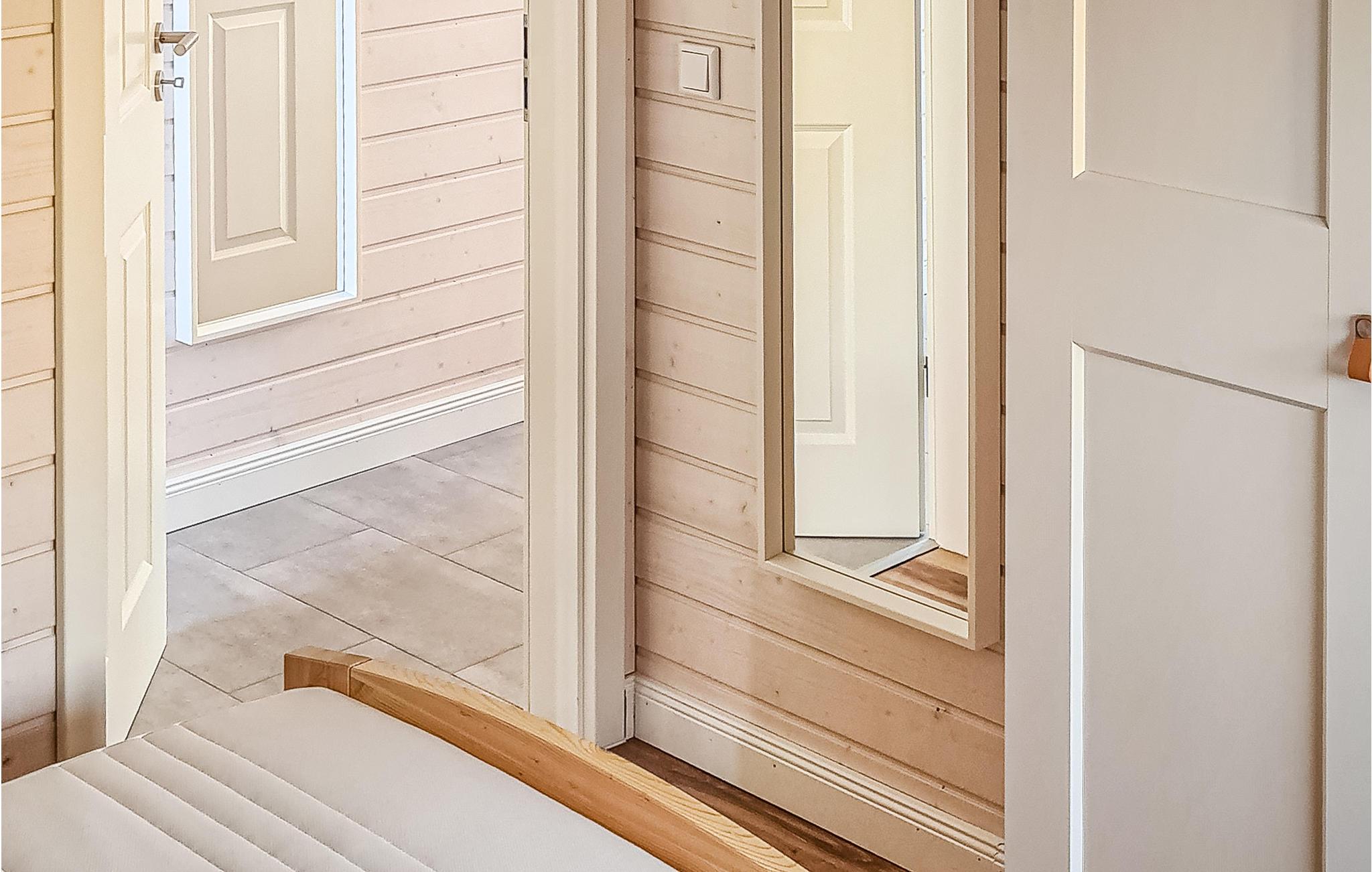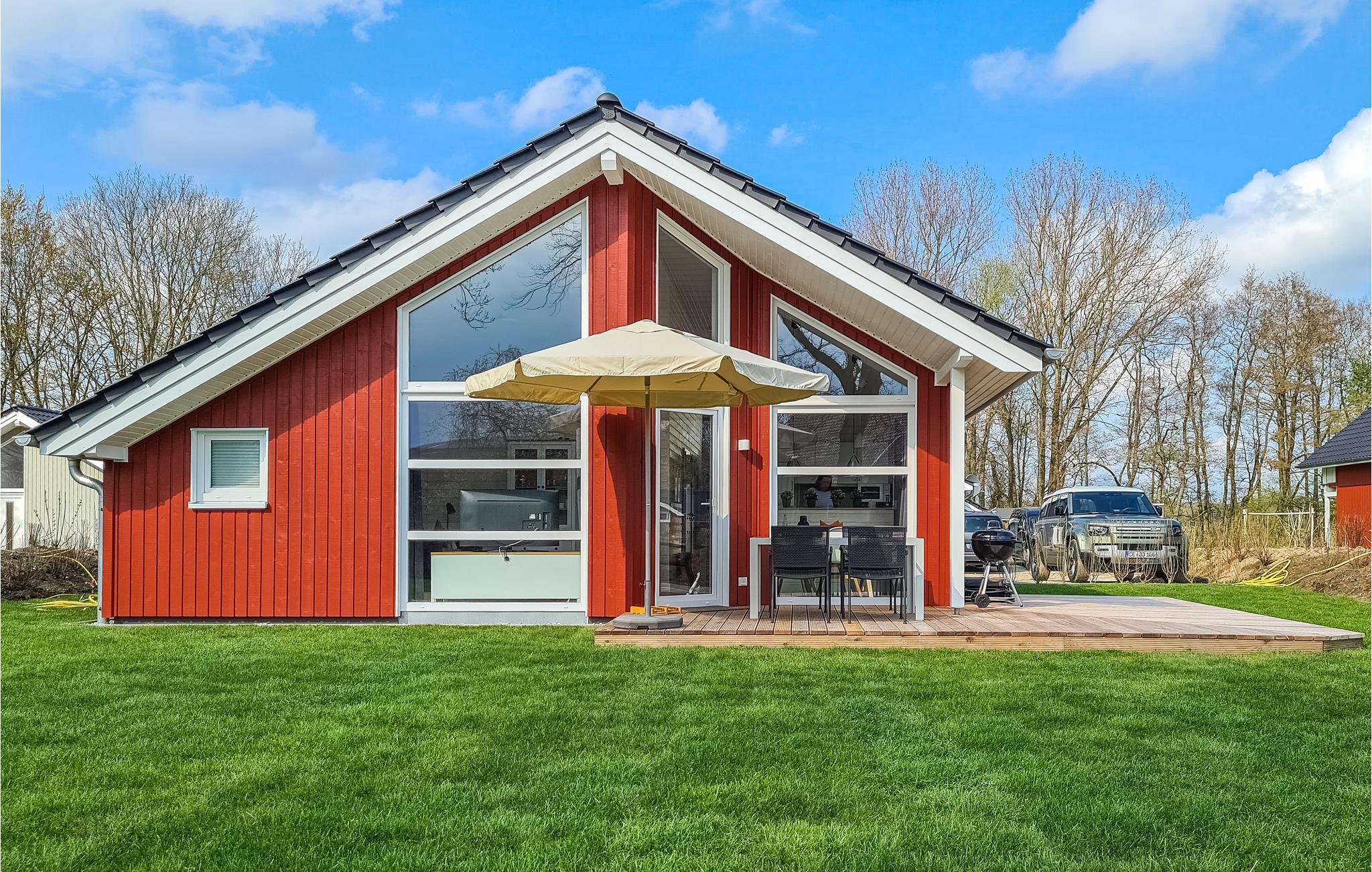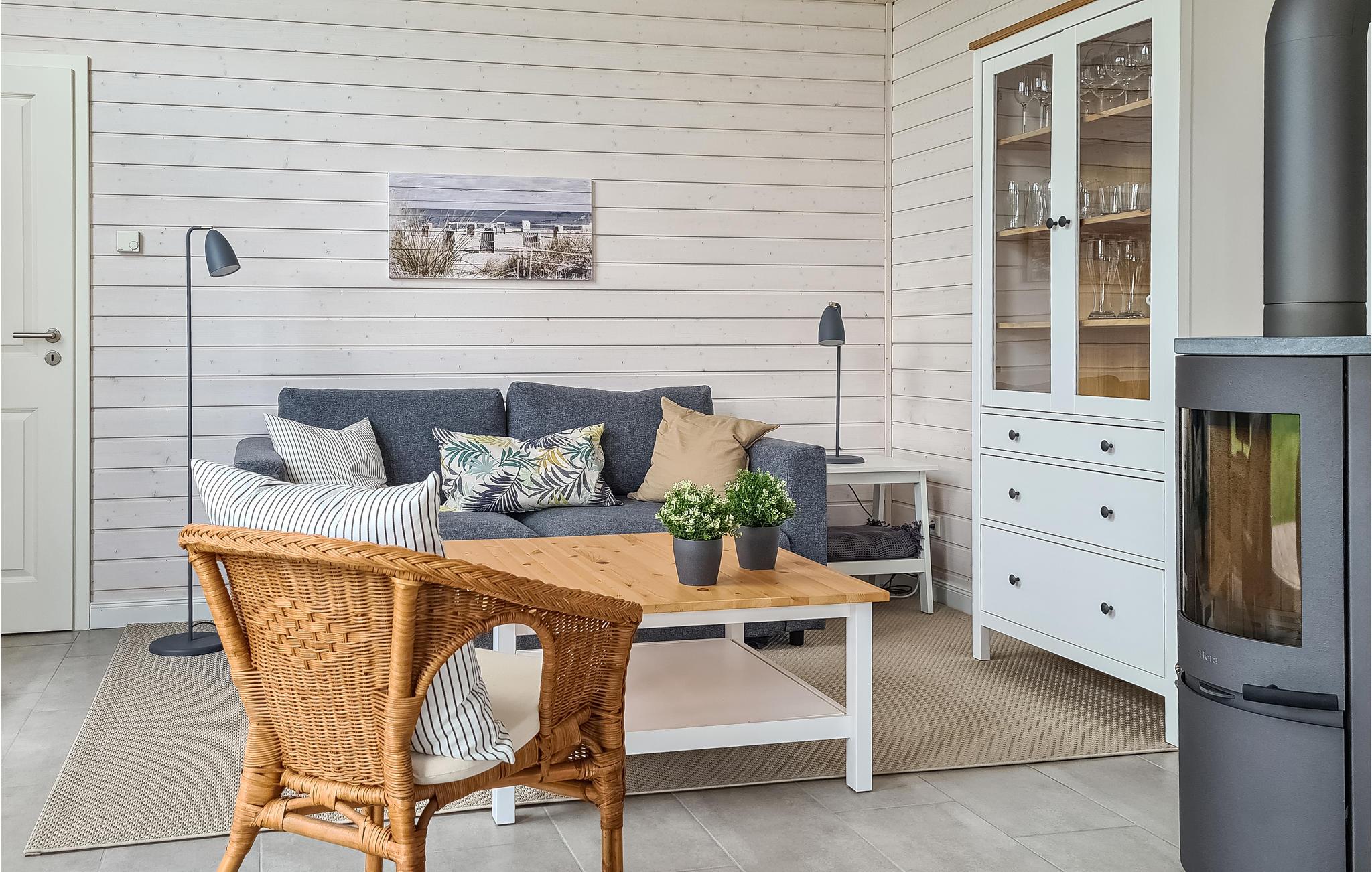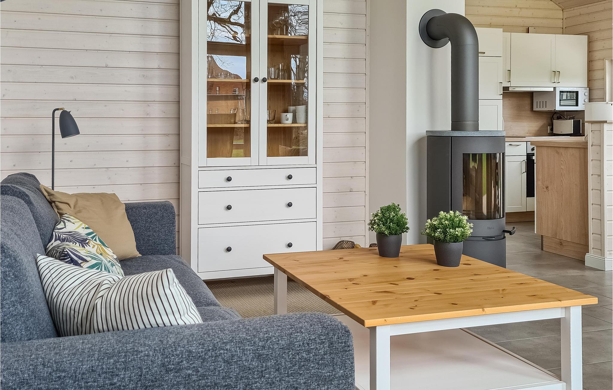 Det moderne træhus imponerer med sin skandinaviske stil og har plads nok til fire voksne og to børn. På grund af det høje åbne loft kan I nyde en behagelig fornemmelse af plads og lyse rum. Indretningen i lyse toner bidrager til den gode atmosfære.