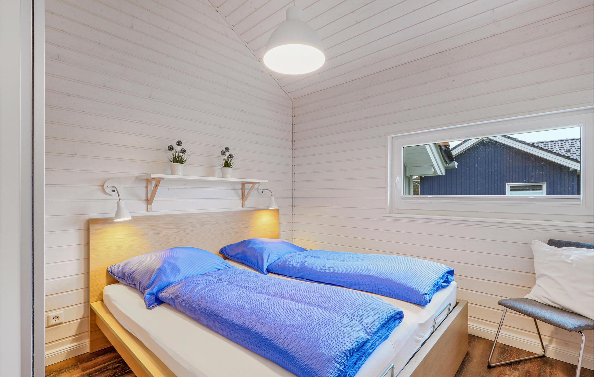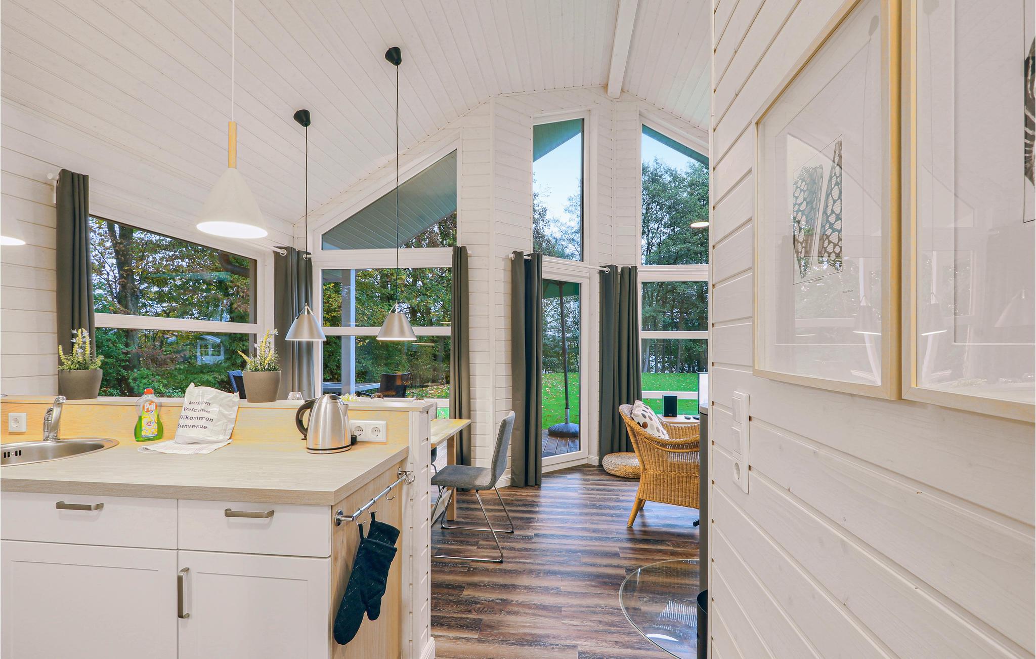 Dette moderne feriehus af træ: 'Waldliebe' giver god plads til fire voksne og to børn. Her er loft til kip og store vinduer, der giver en rummelig og lys atmodsfære. Den maritime indretning i lyse farver bidrager også til den hyggelige stemning.
