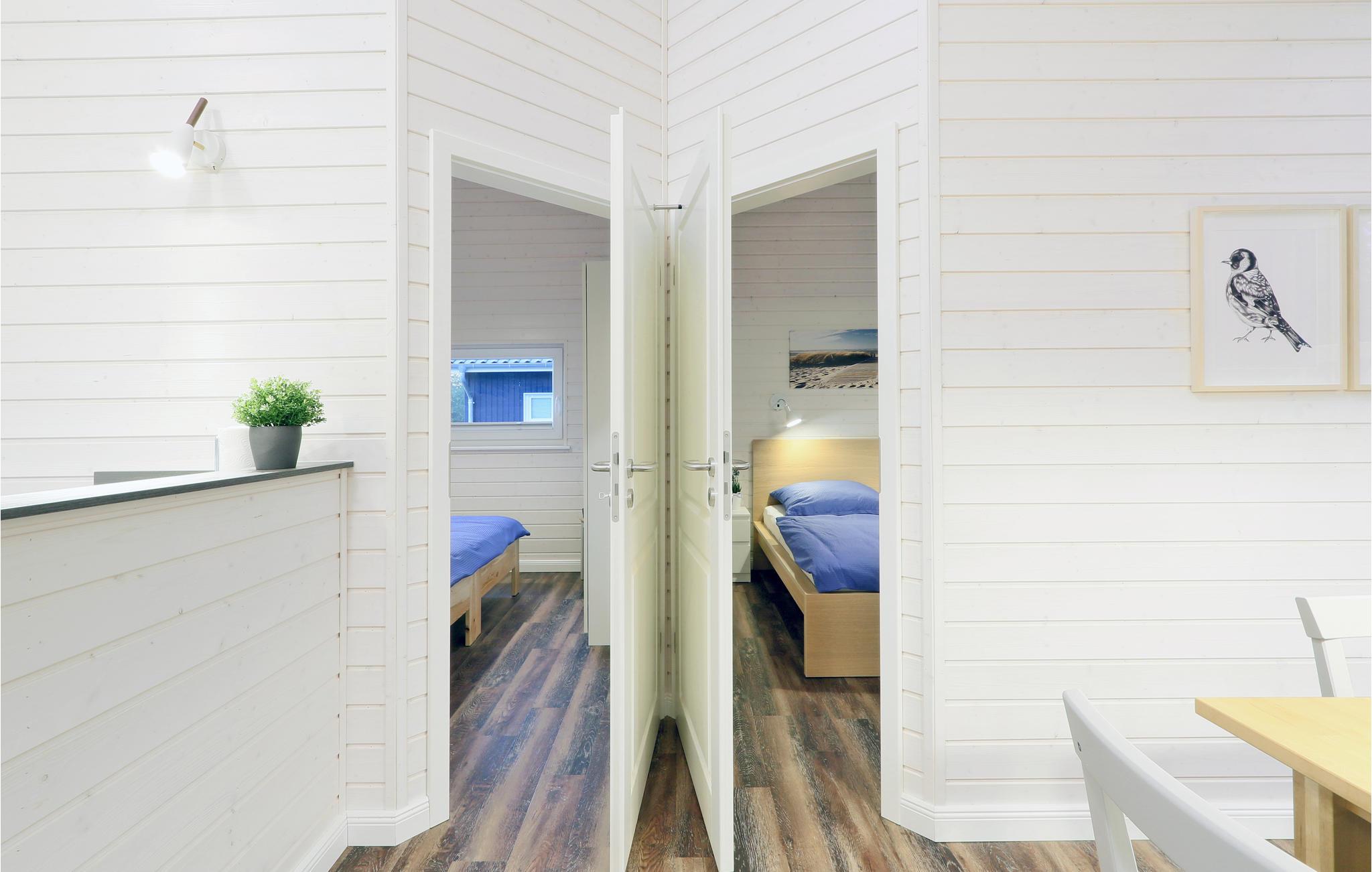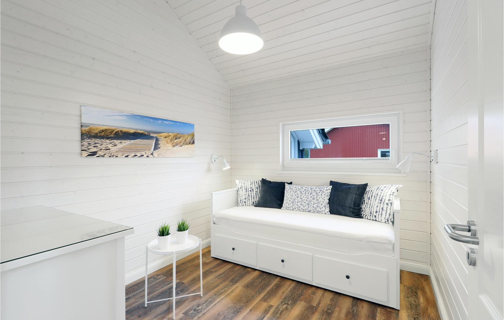 Dette moderne feriehus af træ Seezauber giver god plads til seks voksne og to børn. Her er loft til kip og store vinduer, der giver en rummelig og lys atmodsfære. Den maritime indretning i lyse farver bidrager også til den hyggelige stemning.