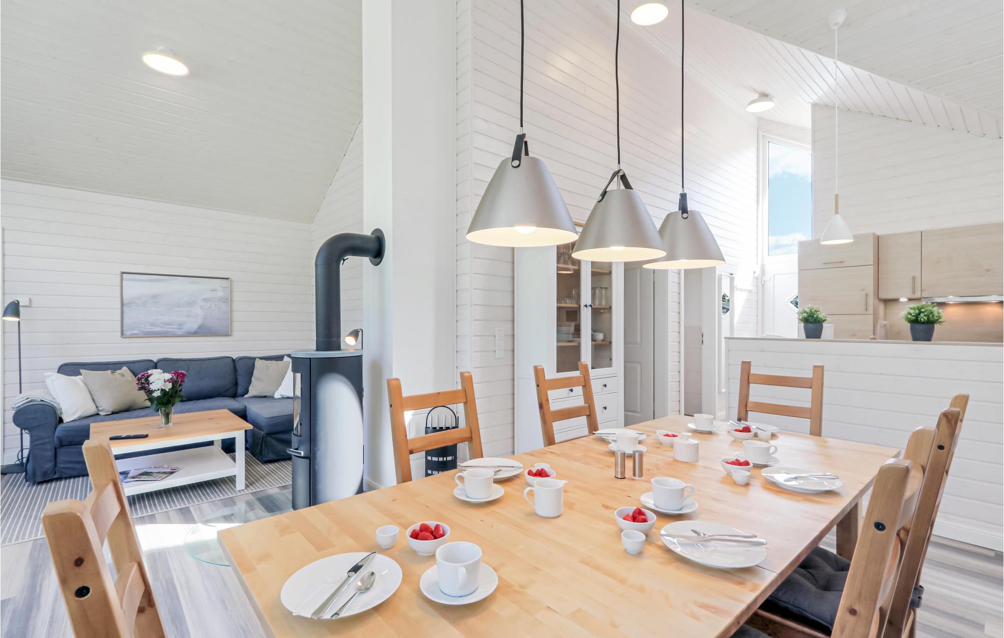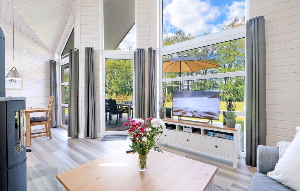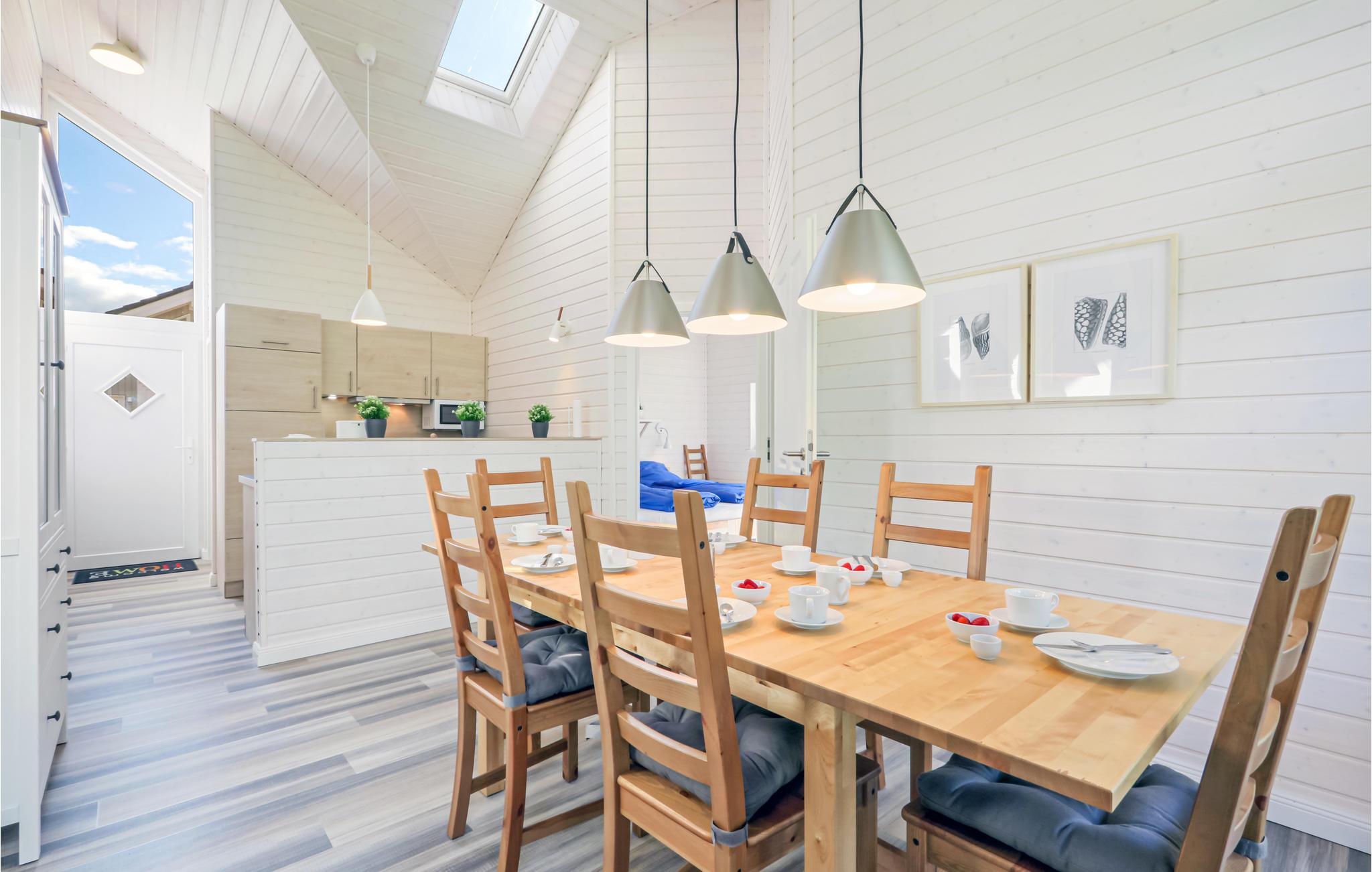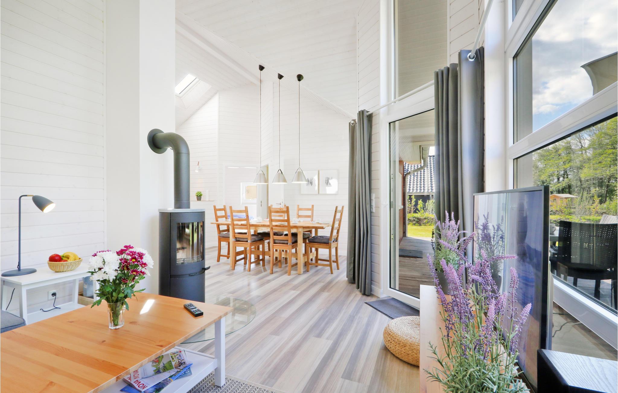Dette moderne feriehus af træ 'Seezauber' giver god plads til op til otte voksne. Her er loft til kip og store vinduer, der giver en rummelig og lys atmodsfære. Den maritime indretning i lyse farver bidrager også til den hyggelige stemning.
