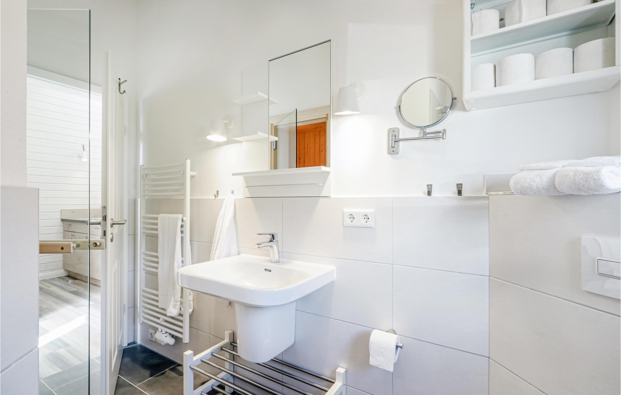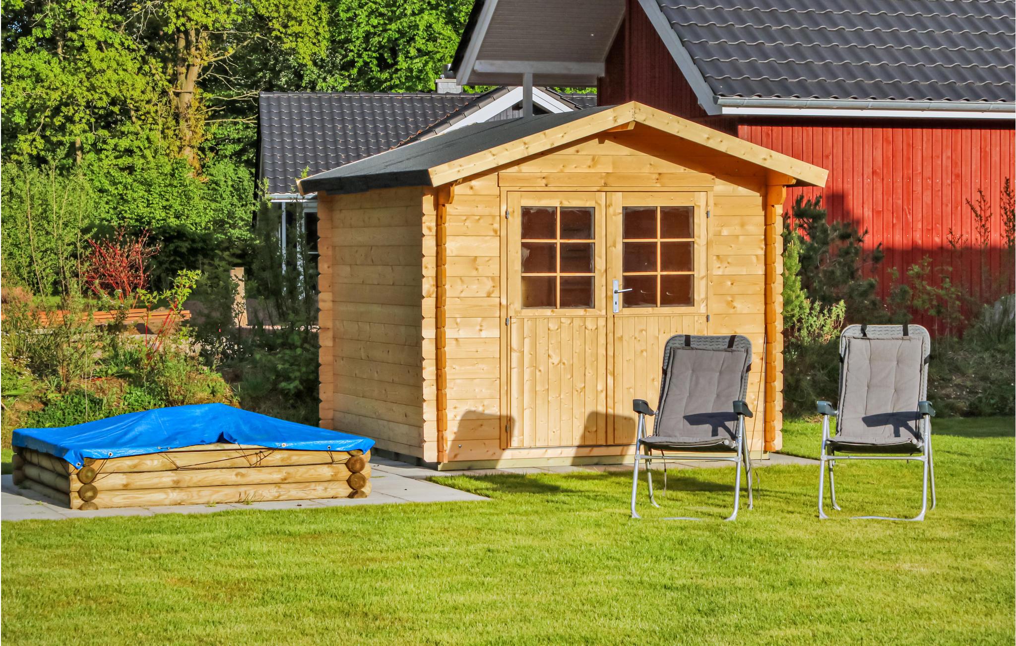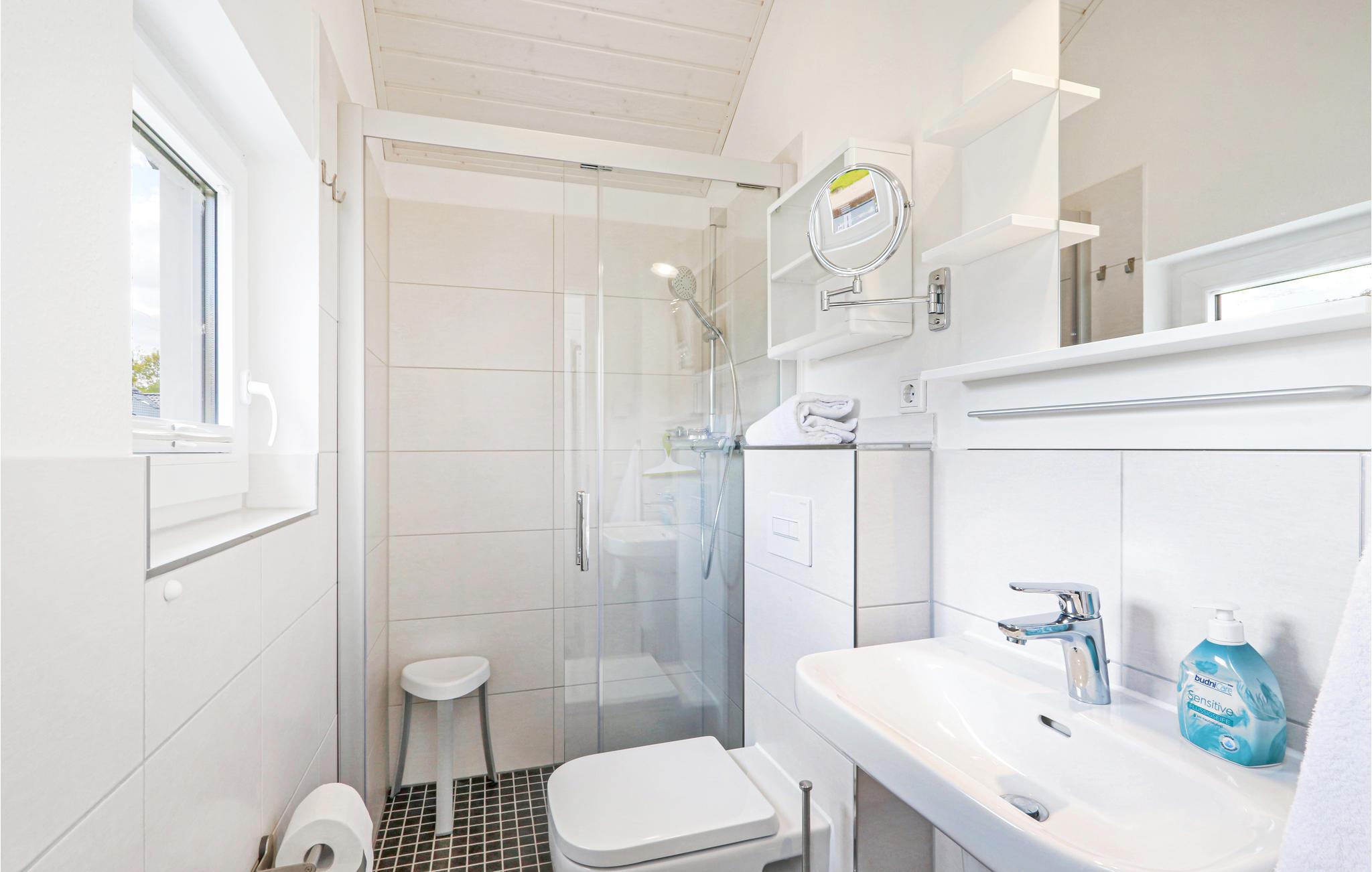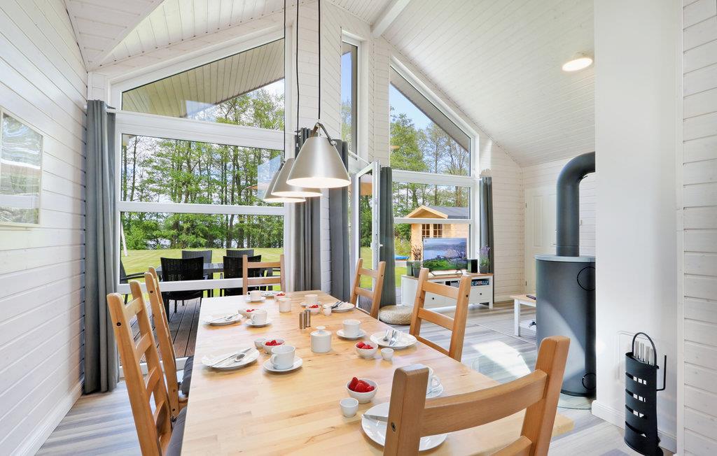 Dette moderne feriehus af træ 'Seezauber' giver god plads til op til otte voksne. Her er loft til kip og store vinduer, der giver en rummelig og lys atmodsfære. Den maritime indretning i lyse farver bidrager også til den hyggelige stemning.
