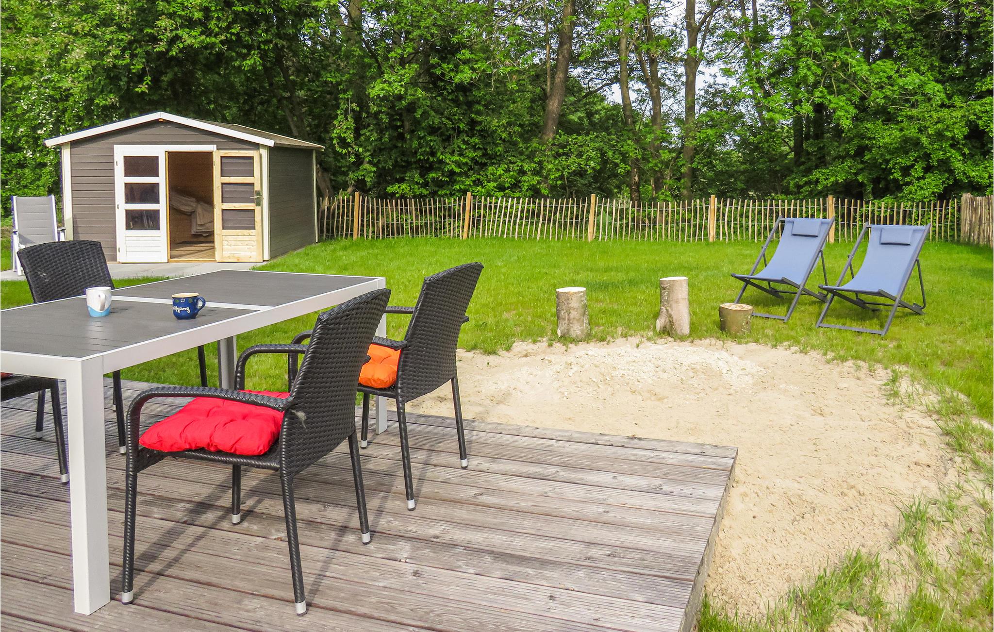 I kan slappe af og spise morgenmad med hele familien på den store terrasse. Havemøbler og liggestole er tilgængelige, og der er desuden en sandkasse og legetøj til børnene samt fire badmintonketchere.