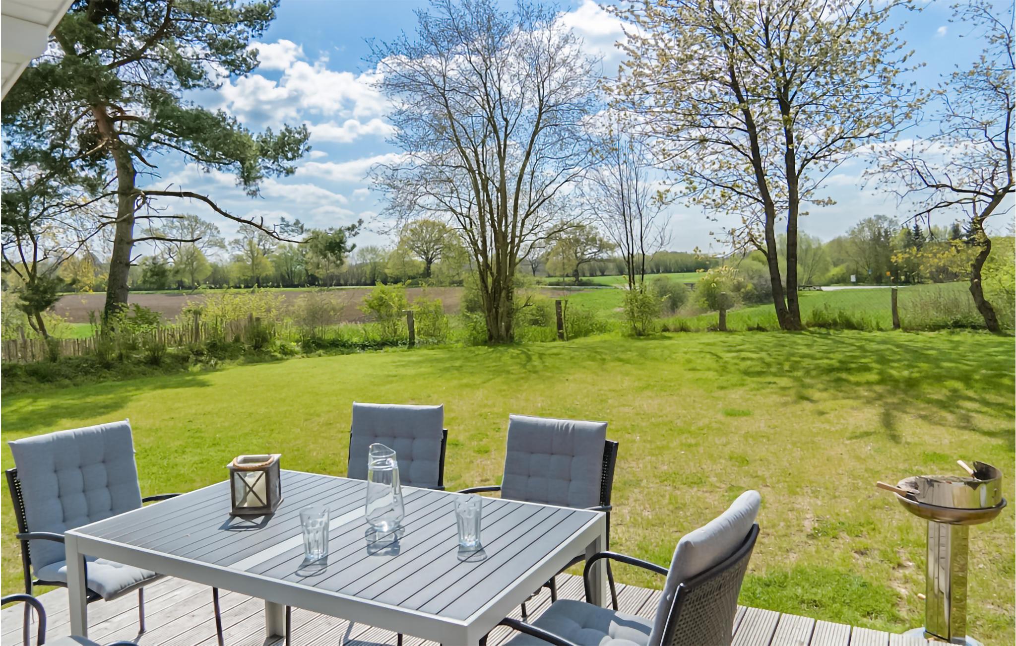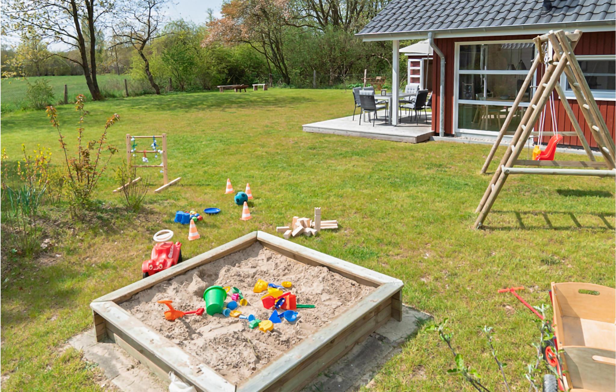 På den rummelige terrasse kan I nyde den vidstrakte udsigt over landskabet og lade sjælen finde ro i liggestolen, mens børnene har adgang til legetøj både inde og ude.