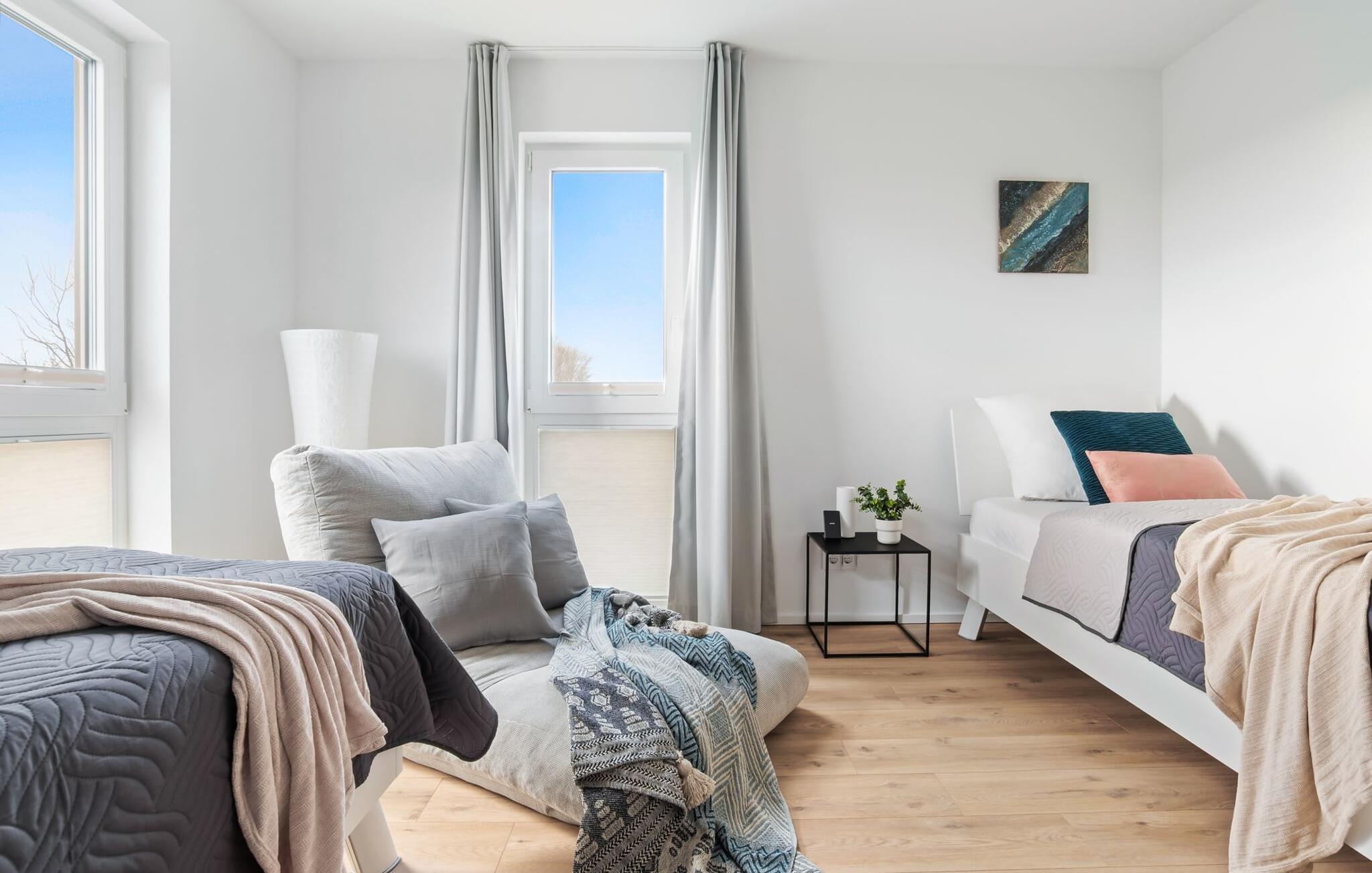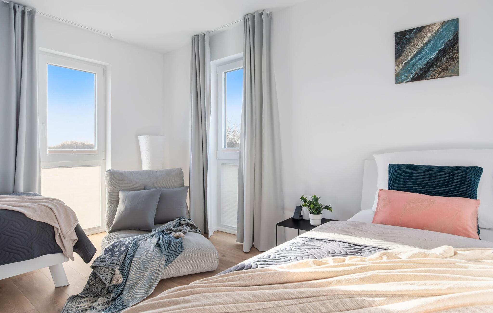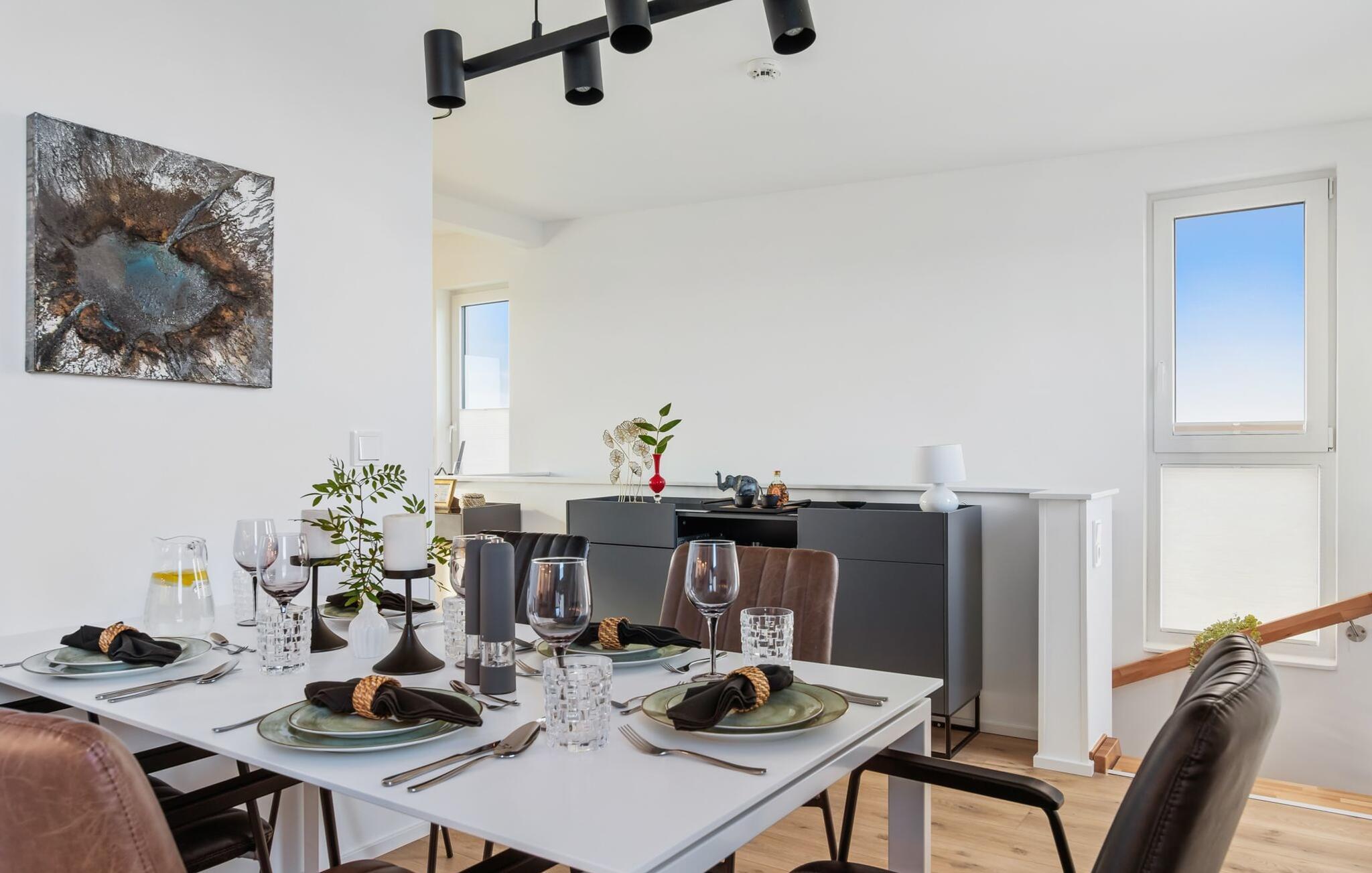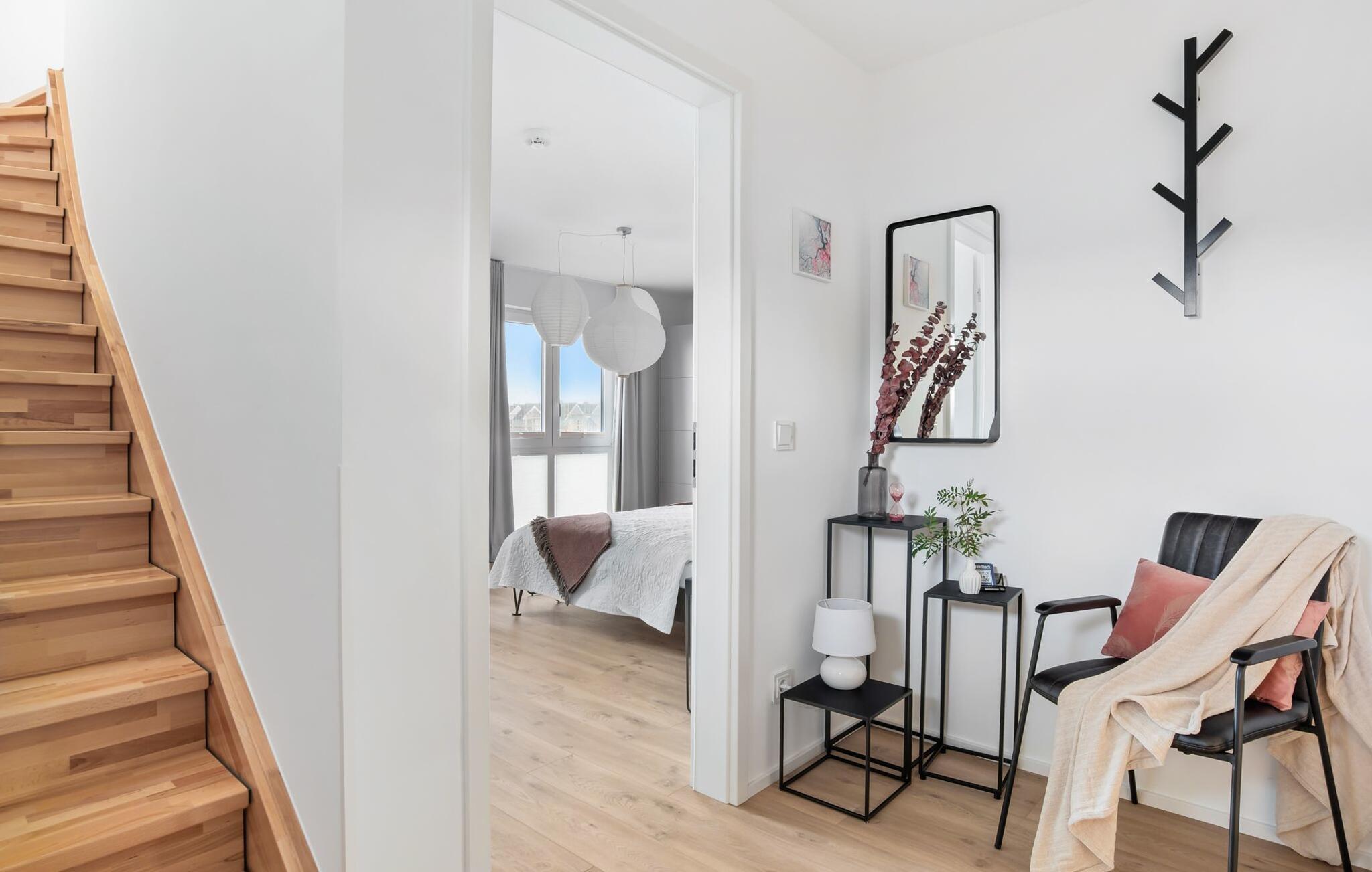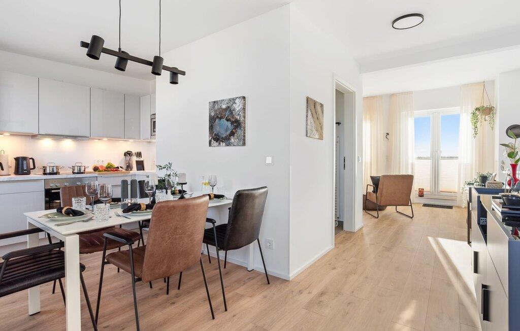 de magiske omgivelser i feriestedet Olpenitz ved Østersøen venter det eksklusive ferieloft Ines på dig, en rummelig etagelejlighed, der strækker sig over 1. og 2. sal og tilbyder et uforlignelig tilflugtssted for jeres ferie. Sandstranden Weidefelder med kiosk, restaurant og strandstole ligger i gåafstand og er et attraktivt rejsemål på alle tider af året. Minigolfbanen med maritimt tema ligger også i umiddelbar nærhed og nydes af både unge og gamle. Lystbådehavnen og havnepromenaden med supermarked og restaurant kan også nås på få minutter til fods. I kommer ind på Ines feriehems på første sal, som rummer soveafdelingen. Tre smagfuldt designede soveværelser inviterer jer til at blive her, hvoraf to er udstyret med komfortable dobbeltsenge og det tredje med to enkeltsenge, der venter på at give jer en afslappende nat. Det rummelige badeværelse på denne etage imponerer ikke kun med et forfriskende brusebad, men også med en infrarød sauna (varmekabine), der lover afslapning og wellness. Den åbne stue åbner op på anden sal og venter på jer med et fuldt udstyret køkken til de højeste standarder. Køkkenet er hjertet af kulinariske lækkerier og hyggelige madlavningsaftener. I tilknytning til køkkenområdet ligger den hyggelige opholdsstue, som byder på en indbydende opholdsstue. Den smagfulde indretning i minimalistisk asiatisk stil giver hele hemsen en harmonisk og beroligende atmosfære. I alt fire fjernsyn, i hvert soveværelse og i stuen, tilbyder underholdning på højeste niveau. Udsigten fra stuen fører til en rummelig terrasse, hvorfra man kan overskue saltvandsengene med deres mangfoldige flora og fauna. Med lidt held vil I opleve det naturlige liv og se hjorte eller kaniner i deres naturlige miljø. På denne etage finder I et andet badeværelse med badekar, som runder følelsen af og sikrer et afslappende ophold på alle tider af året. Ferienloft Ines ferielejlighed tilbyder også to private parkeringspladser direkte foran huset, som gør det muligt for jer at rejse komfortabelt. Den varme invitation går også til vores firbenede venner, da hunde er velkomne i denne eksklusive bolig. WiFi er også tilgængeligt i hele lejligheden, så I altid kan holde forbindelsen til verden. Ferieloftet Ines er ikke bare overnatning, men et sted, hvor luksus, natur og afslapning mødes i perfekt harmoni. Forkæl jer selv med et uforglemmeligt ophold ved Østersøen, og lad jer fortrylle af magien ved dette ekstraordinære ferieloft. Vores favoritsted Nyd Østersøbrisen med hele familien på terrassen og reflekter over dagen. Bemærk venligst: OstseeResort Olpenitz er meget populært, og der bygges fortsat i parken. Ikke desto mindre kan I se frem til en 5-stjernet standard og et førsteklasses ophold. Byggeaktiviteterne kommer ikke til at forstyrre jer på ferien, og derfor gives der ikke yderligere afslag i prisen.