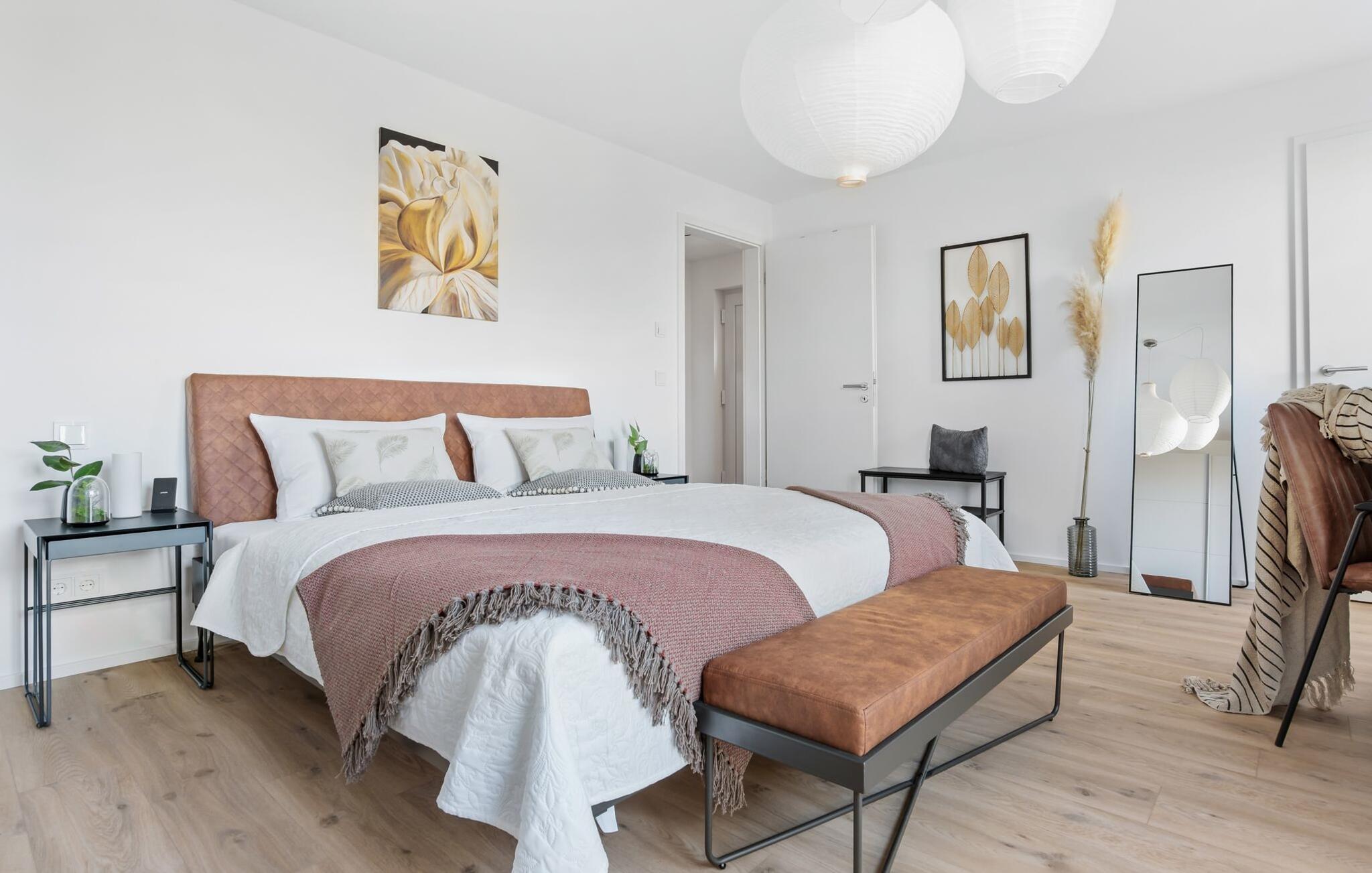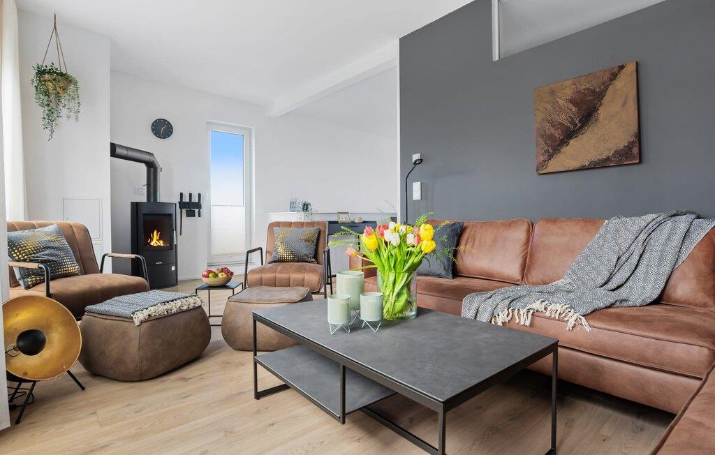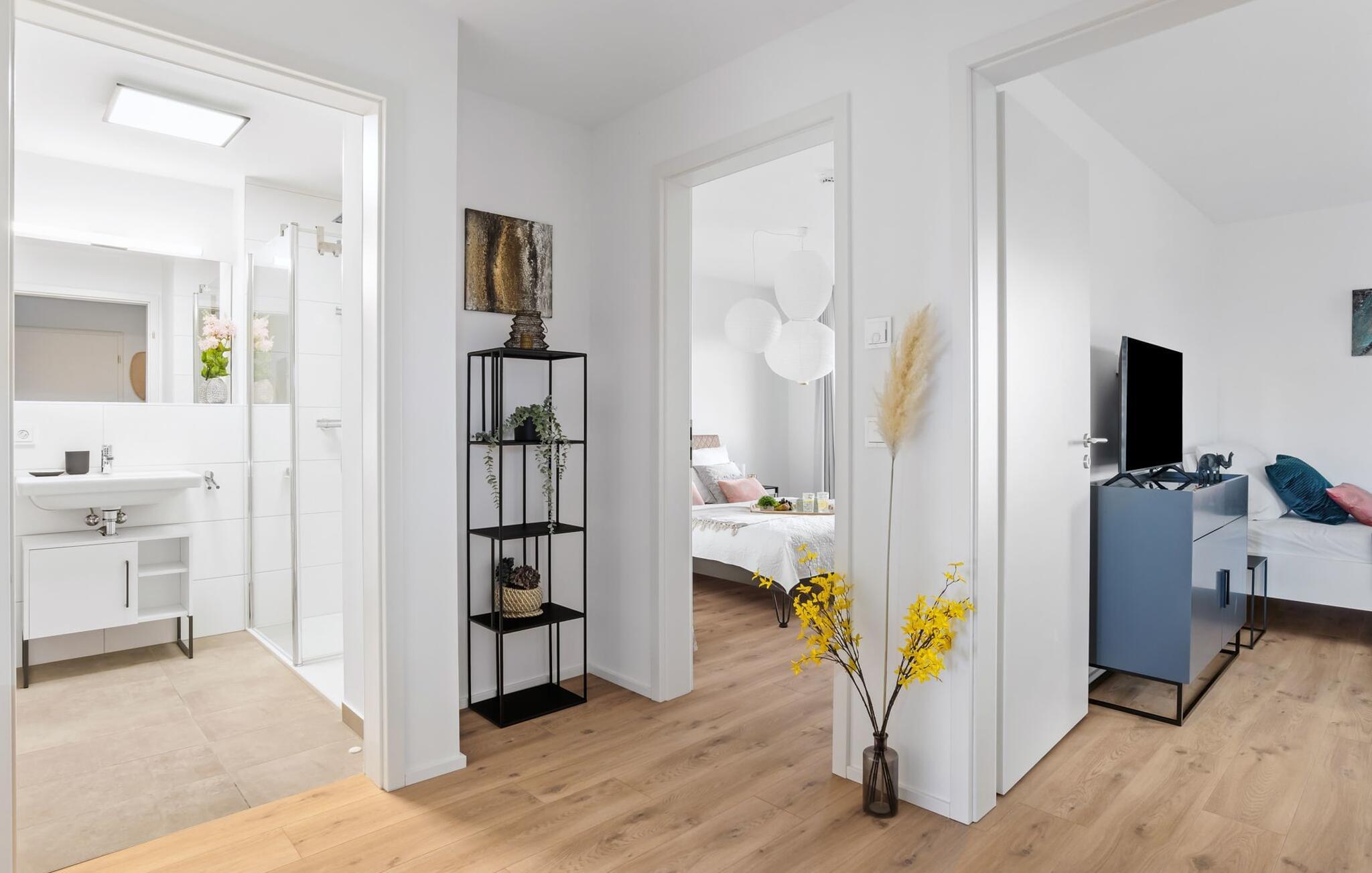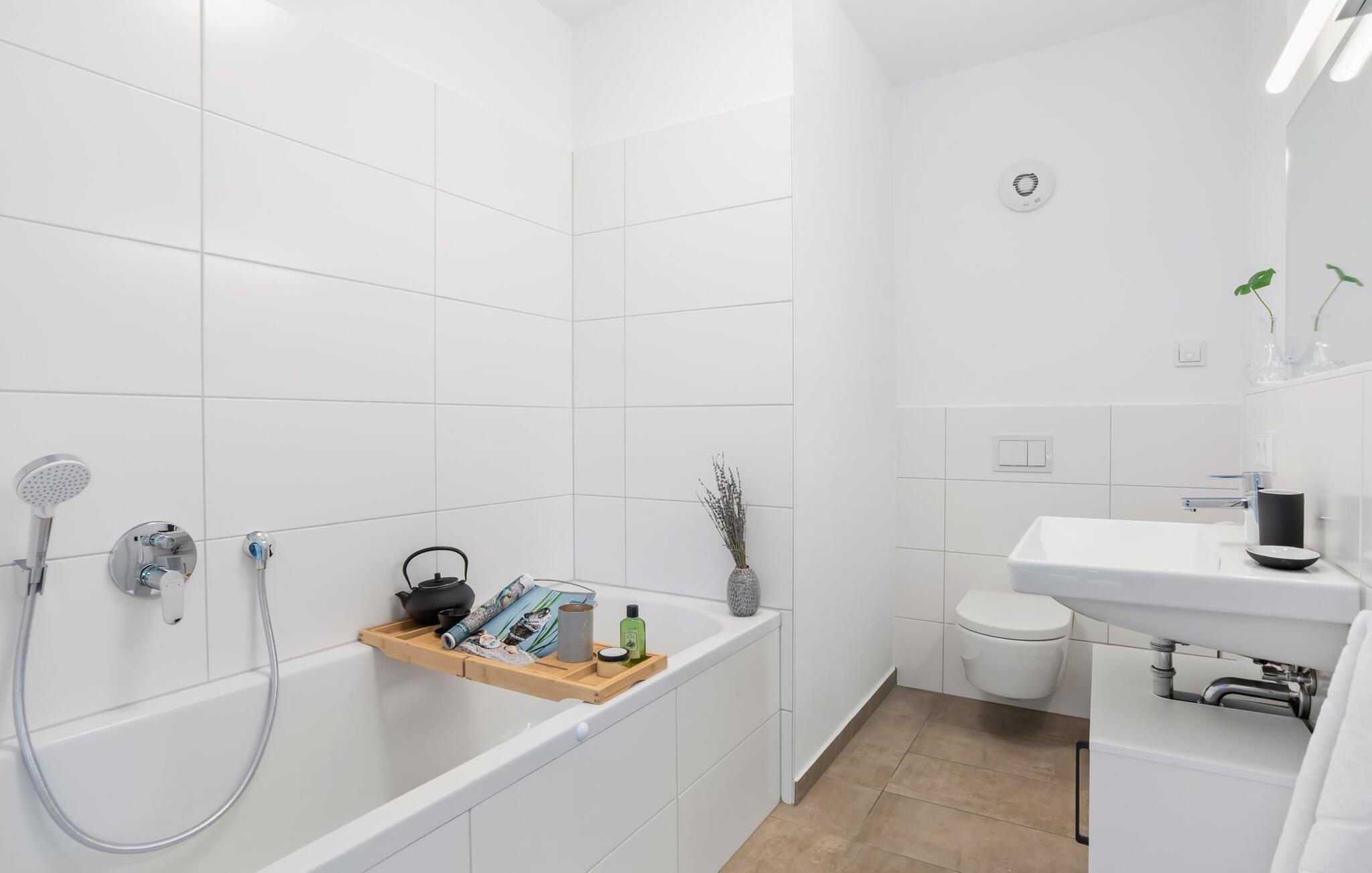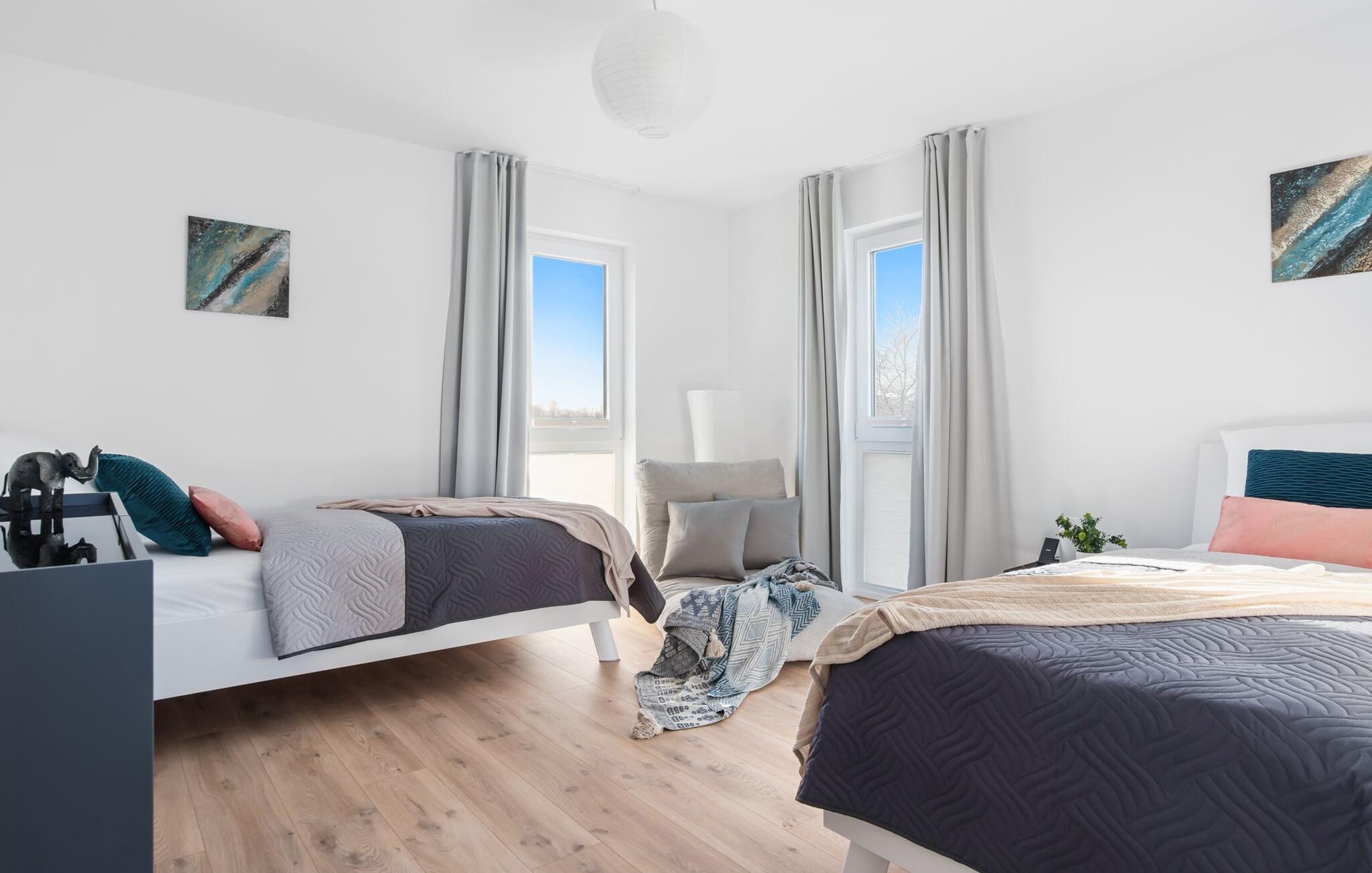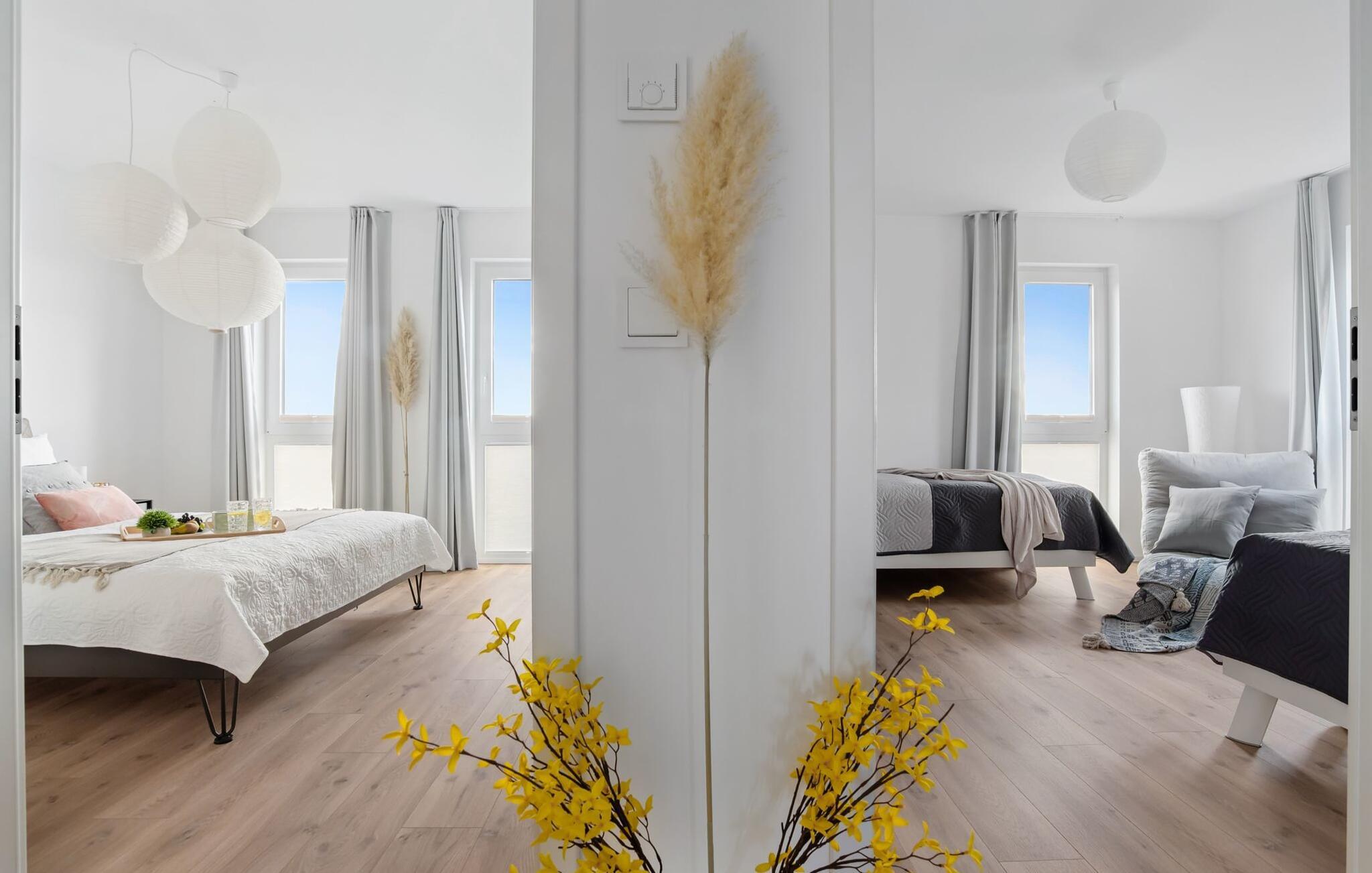 de magiske omgivelser i feriestedet Olpenitz ved Østersøen venter det eksklusive ferieloft Ines på dig, en rummelig etagelejlighed, der strækker sig over 1. og 2. sal og tilbyder et uforlignelig tilflugtssted for jeres ferie. Sandstranden Weidefelder med kiosk, restaurant og strandstole ligger i gåafstand og er et attraktivt rejsemål på alle tider af året. Minigolfbanen med maritimt tema ligger også i umiddelbar nærhed og nydes af både unge og gamle. Lystbådehavnen og havnepromenaden med supermarked og restaurant kan også nås på få minutter til fods. I kommer ind på Ines feriehems på første sal, som rummer soveafdelingen. Tre smagfuldt designede soveværelser inviterer jer til at blive her, hvoraf to er udstyret med komfortable dobbeltsenge og det tredje med to enkeltsenge, der venter på at give jer en afslappende nat. Det rummelige badeværelse på denne etage imponerer ikke kun med et forfriskende brusebad, men også med en infrarød sauna (varmekabine), der lover afslapning og wellness. Den åbne stue åbner op på anden sal og venter på jer med et fuldt udstyret køkken til de højeste standarder. Køkkenet er hjertet af kulinariske lækkerier og hyggelige madlavningsaftener. I tilknytning til køkkenområdet ligger den hyggelige opholdsstue, som byder på en indbydende opholdsstue. Den smagfulde indretning i minimalistisk asiatisk stil giver hele hemsen en harmonisk og beroligende atmosfære. I alt fire fjernsyn, i hvert soveværelse og i stuen, tilbyder underholdning på højeste niveau. Udsigten fra stuen fører til en rummelig terrasse, hvorfra man kan overskue saltvandsengene med deres mangfoldige flora og fauna. Med lidt held vil I opleve det naturlige liv og se hjorte eller kaniner i deres naturlige miljø. På denne etage finder I et andet badeværelse med badekar, som runder følelsen af og sikrer et afslappende ophold på alle tider af året. Ferienloft Ines ferielejlighed tilbyder også to private parkeringspladser direkte foran huset, som gør det muligt for jer at rejse komfortabelt. Den varme invitation går også til vores firbenede venner, da hunde er velkomne i denne eksklusive bolig. WiFi er også tilgængeligt i hele lejligheden, så I altid kan holde forbindelsen til verden. Ferieloftet Ines er ikke bare overnatning, men et sted, hvor luksus, natur og afslapning mødes i perfekt harmoni. Forkæl jer selv med et uforglemmeligt ophold ved Østersøen, og lad jer fortrylle af magien ved dette ekstraordinære ferieloft. Vores favoritsted Nyd Østersøbrisen med hele familien på terrassen og reflekter over dagen. Bemærk venligst: OstseeResort Olpenitz er meget populært, og der bygges fortsat i parken. Ikke desto mindre kan I se frem til en 5-stjernet standard og et førsteklasses ophold. Byggeaktiviteterne kommer ikke til at forstyrre jer på ferien, og derfor gives der ikke yderligere afslag i prisen.