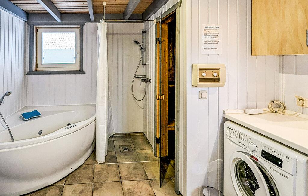 Soveværelset i stueetagen har en dobbeltseng, og på øverste etage finder I yderligere to soveværelser. Den ene er med to enkeltsenge og den anden med dobbeltseng. Badeværelset har et bidet, og der er også hårtørrer til rådighed i ferieejendommen.