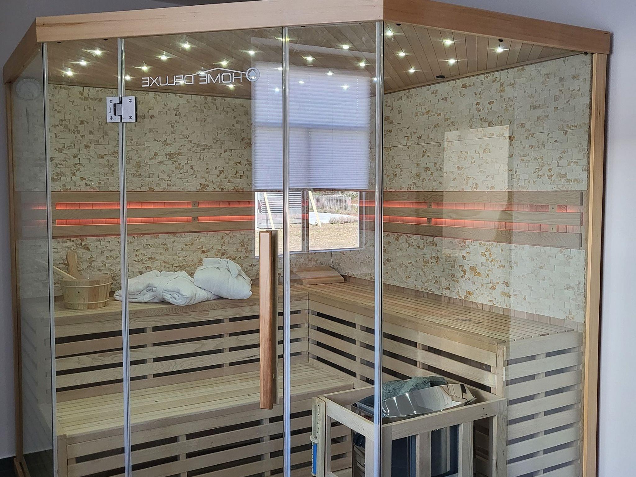 Für das besondere Wohlfühlerlebnis befindet sich im Scheunengebäude ein kleiner Wellnessbereich mit Sauna, Infrarotkabine, Relaxliegen und großer Whirlwanne für 2 Personen. Vom Ruhebereich aus haben Sie Zugang zu einer kleinen Privatterrasse mit Sonnenliegen auf der Sie entspannen können.