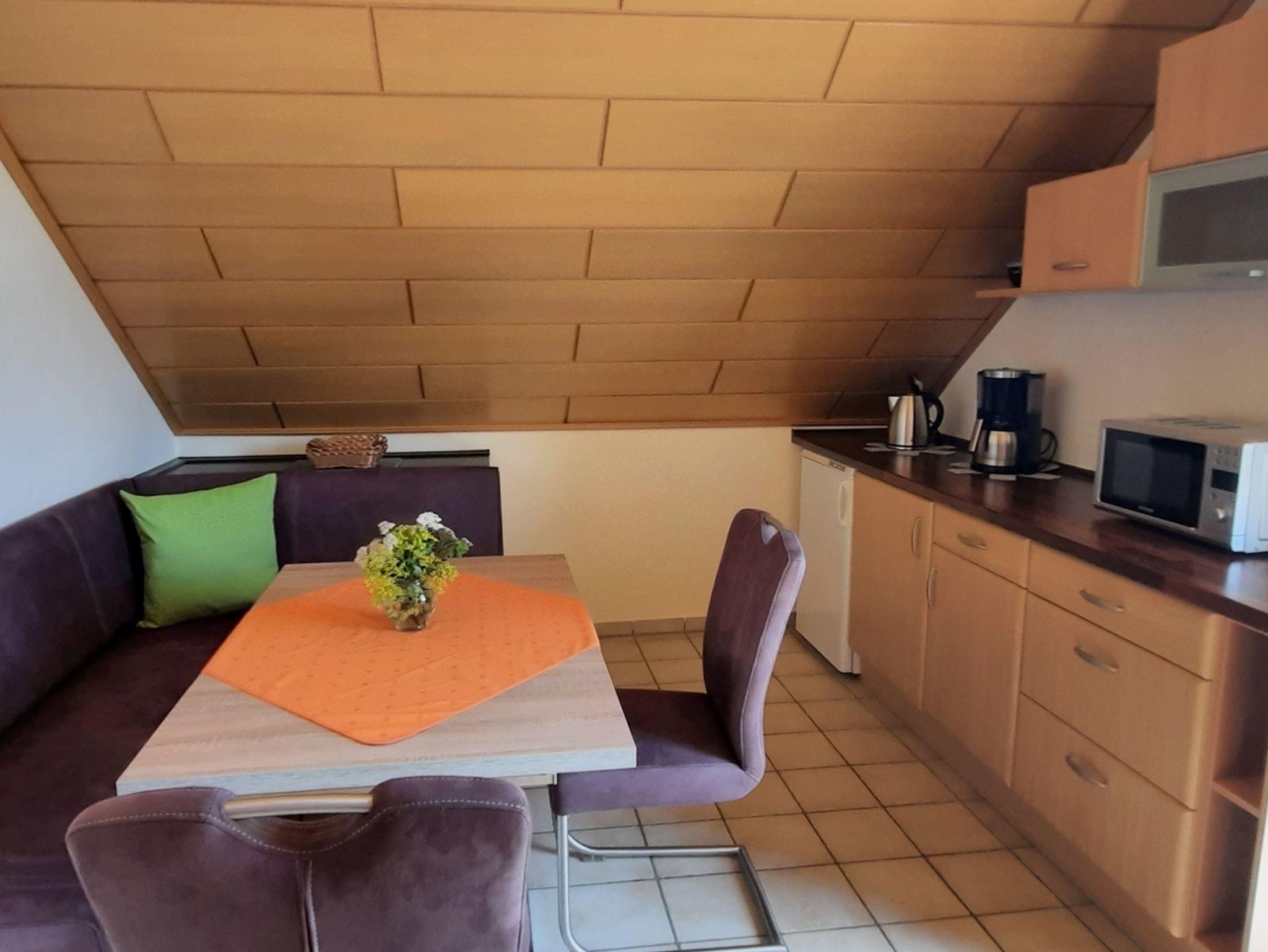 Vollständig eingerichtete Küche mit Geschirr und Besteck, Herd (Ceranfeld) und Backofen, Spülmaschine, Microwelle, Gefrierschrank, Kühlschrank, Kaffeemaschine, Toaster, Wasserkocher, Eierkocher, elektrischer Handmixer.