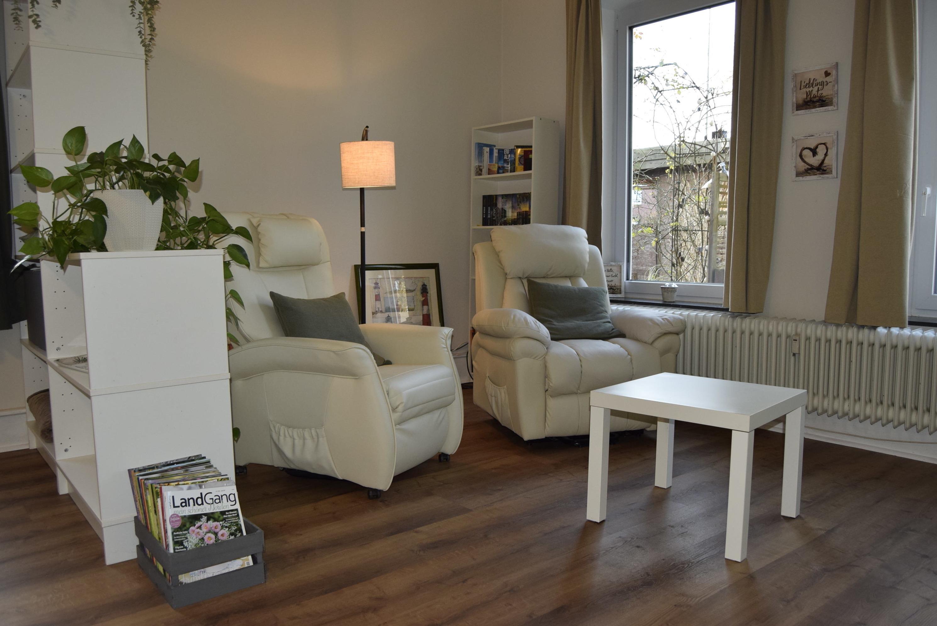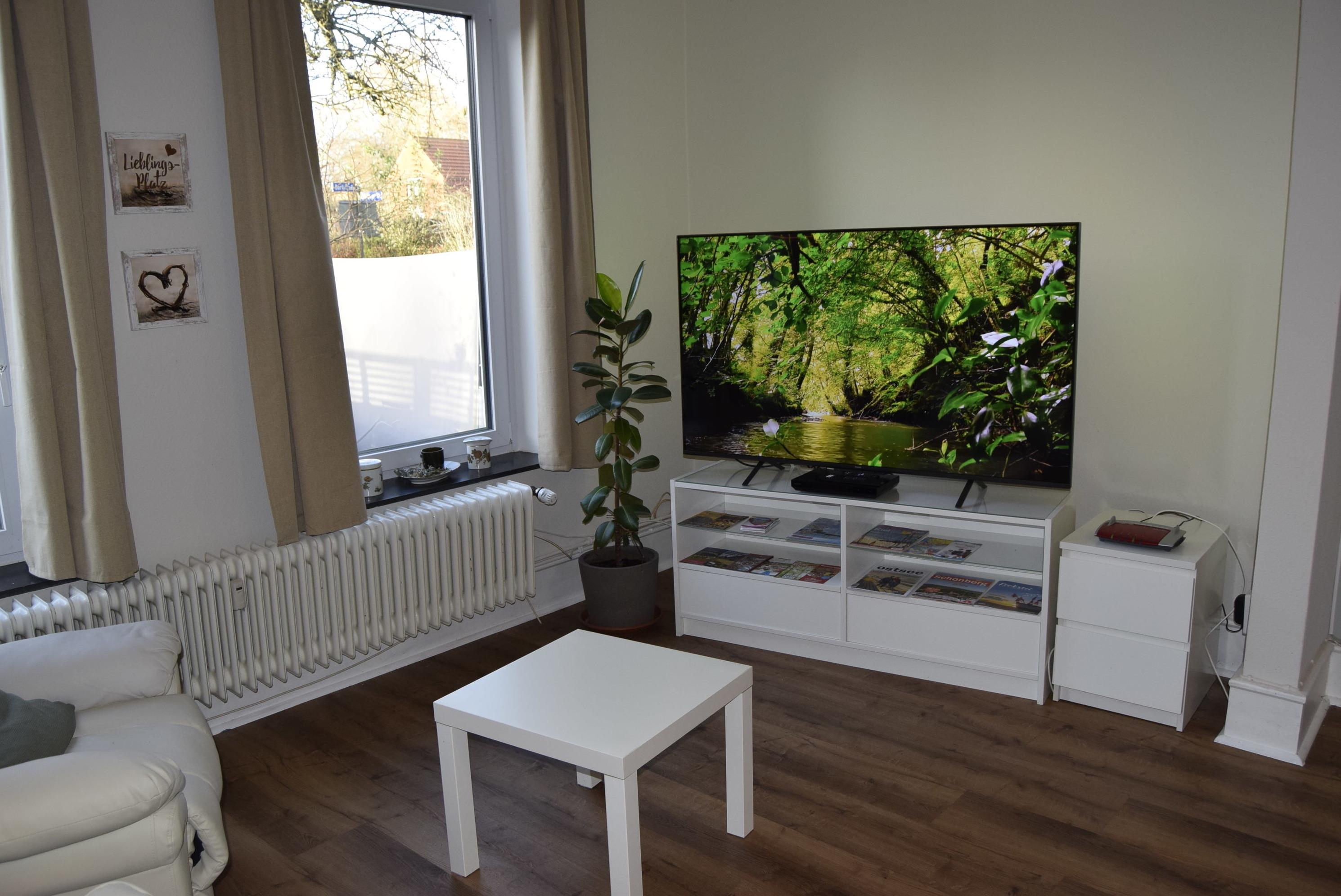 Für gemeinsame Fernsehabende gibt es ein Wohnzimmer mit gemütlicher Couch und Fernseher mit Magenta TV.