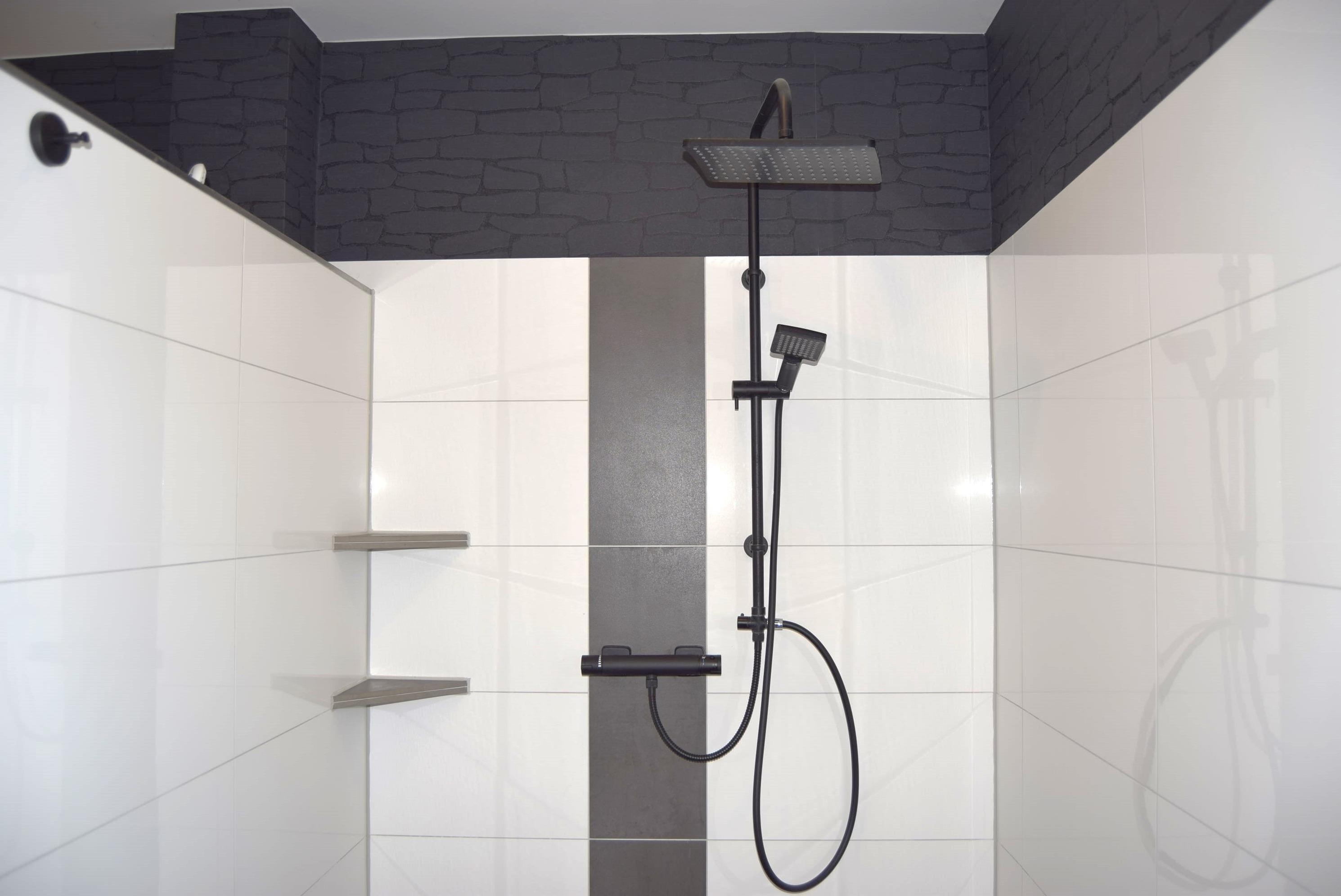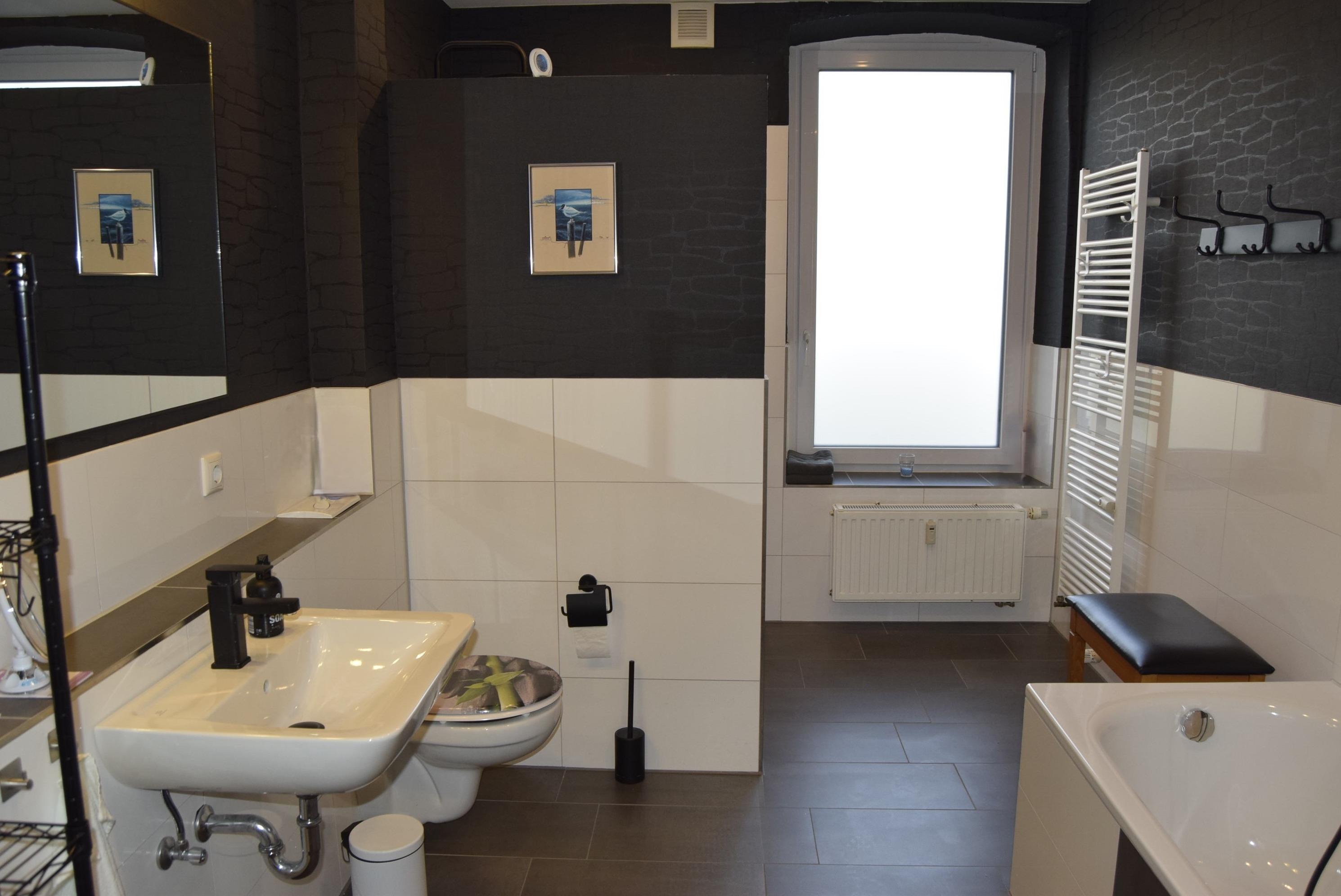 Es gibt eine ebenerdige Dusche und eine Badewanne.