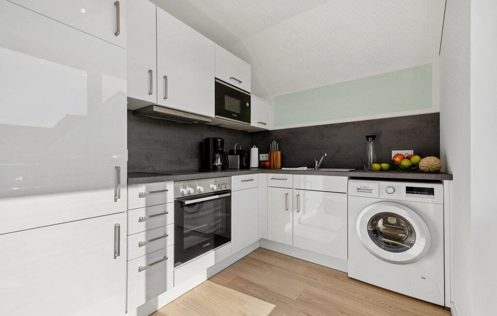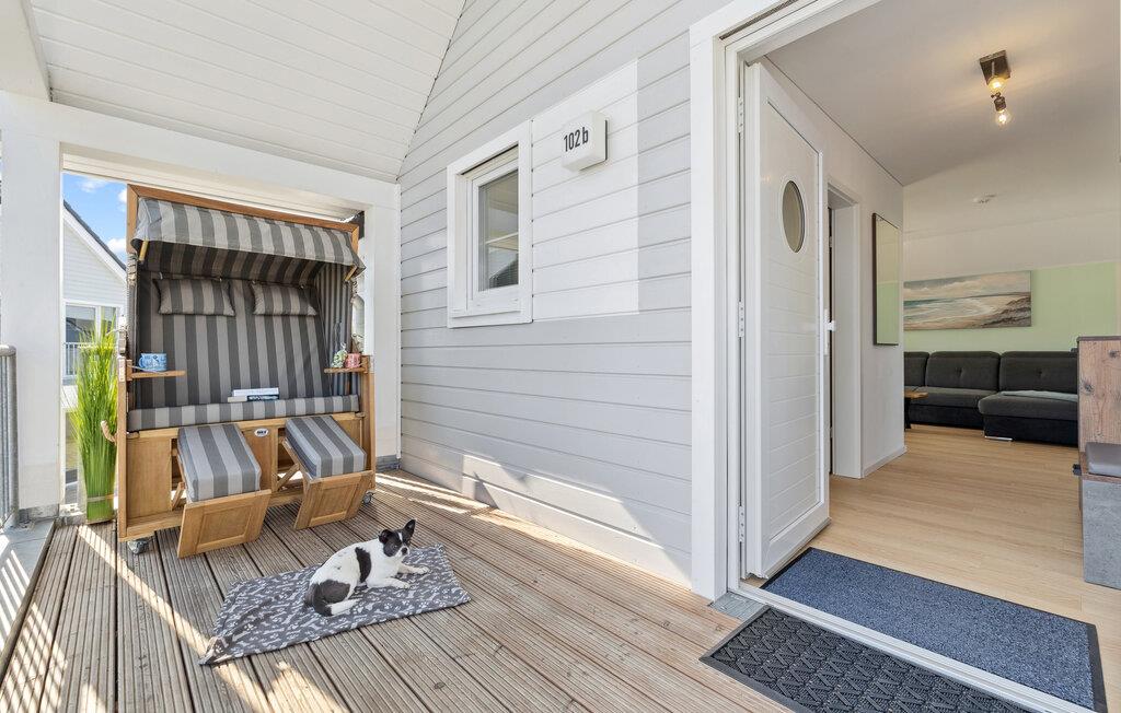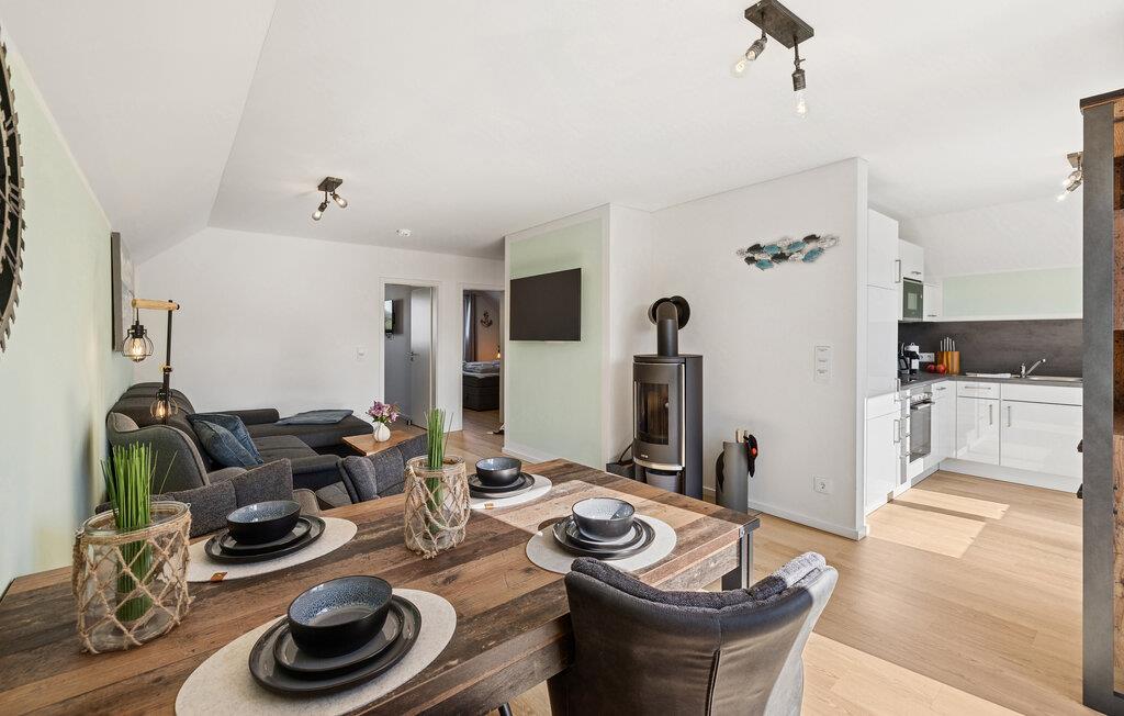 En hyggelig balkon med en strandstol byder jer velkommen, allerede inden I træder ind i lejligheden. Når I træder ind i lejligheden, åbner en gang sig op, der fører til den rummelige, åbne stue/spisestue med et tilstødende køkken. Her finder I et komfortabelt siddeområde, der lægger op til at slappe af, mens Smart TV'et sørger for den bedste underholdning. Pejsen giver rummet en rustik atmosfære, ideel til hyggelige aftener. Et stort spisebord tilbyder ikke kun masser af plads til fælles måltider, men bliver også centrum for muntre sammenkomster.
