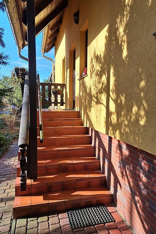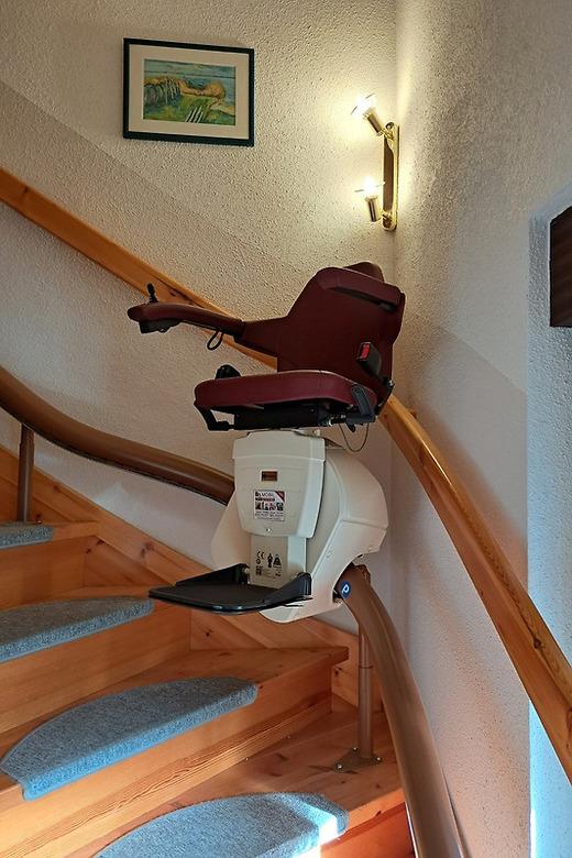 Mit unserem Treppenlift gelangen auch Personen mit Handicap ins Obergeschoss. Jedoch muss die Außentreppe (siehe Foto) überwunden werden.