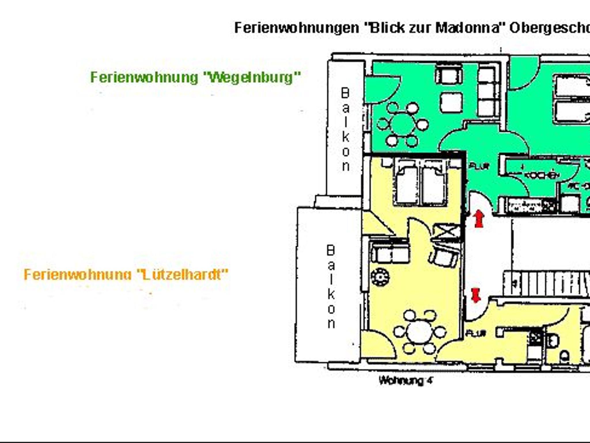 Wohnung Wegelnburg - 50 qm: Schöne, geräumige Wohnung mit Küche, 1 Doppelschlafzimmer, Wohnzimmer mit Sofabett, Sat-TV, W-Lan, Radio, DU/WC, 2 Balkonen, Telefon.