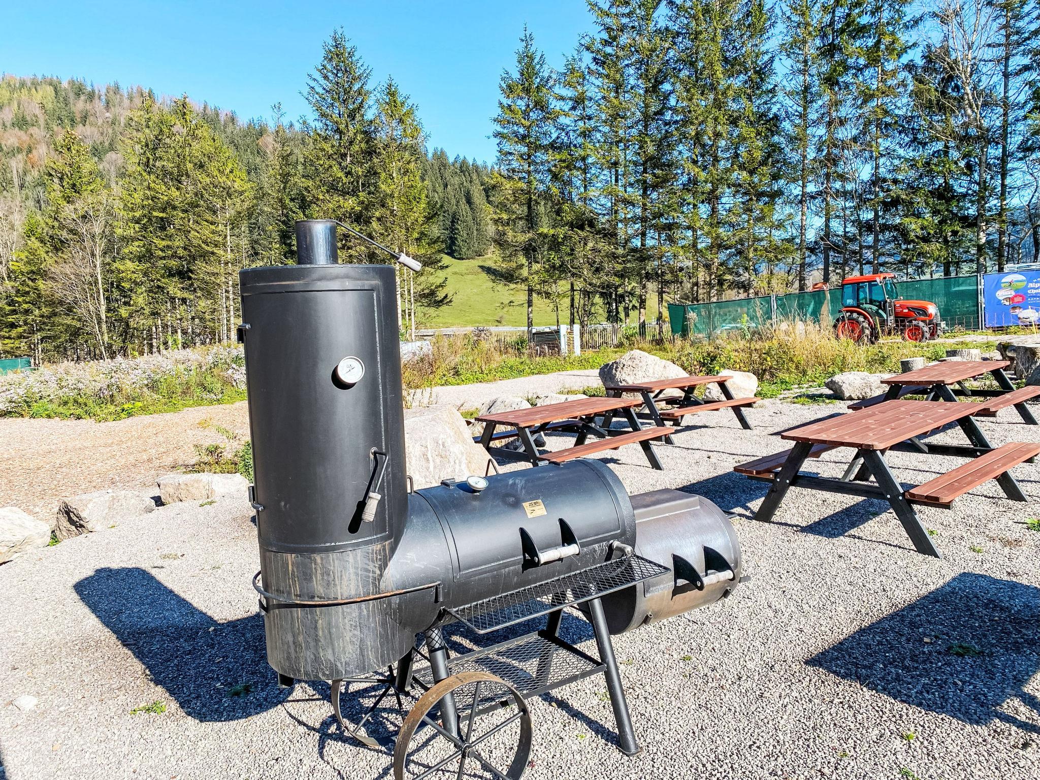 "Tiny Haus Glockenalm-Haus Puppenkiste", 3-room mobile home 33 m2 on 2 levels. Object suitable for 2 adults + 3 children. Tasteful and cosy furnishings: living/dining room with satellite TV and air conditioning. 1 room with 1 double bed (160 cm, length 200 cm). Open kitchen (2 ceramic glass hob hotplates, kettle, electric coffee machine). Shower/WC. Upper floor: (steep stair), 1 open room with sloping ceilings, ceiling height 50 - 110 cm with 3 sleeping facilities (3 x 80 cm, length 200 cm). Electric heating. Terrace. Terrace furniture. Beautiful view of the mountains. Parking (1 car) at the house. Please note: smoke alarm.